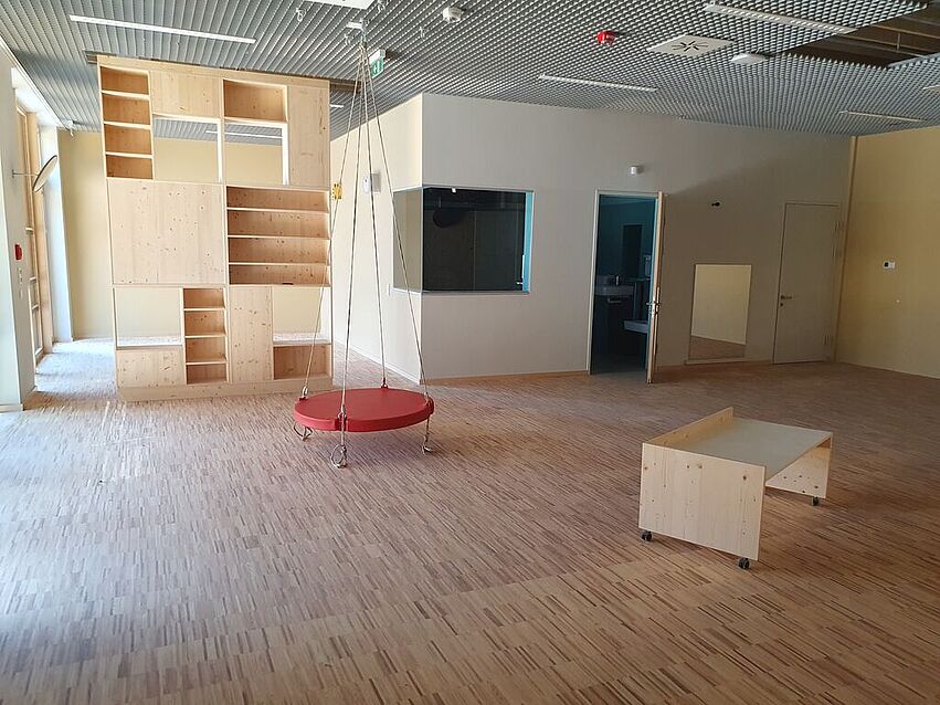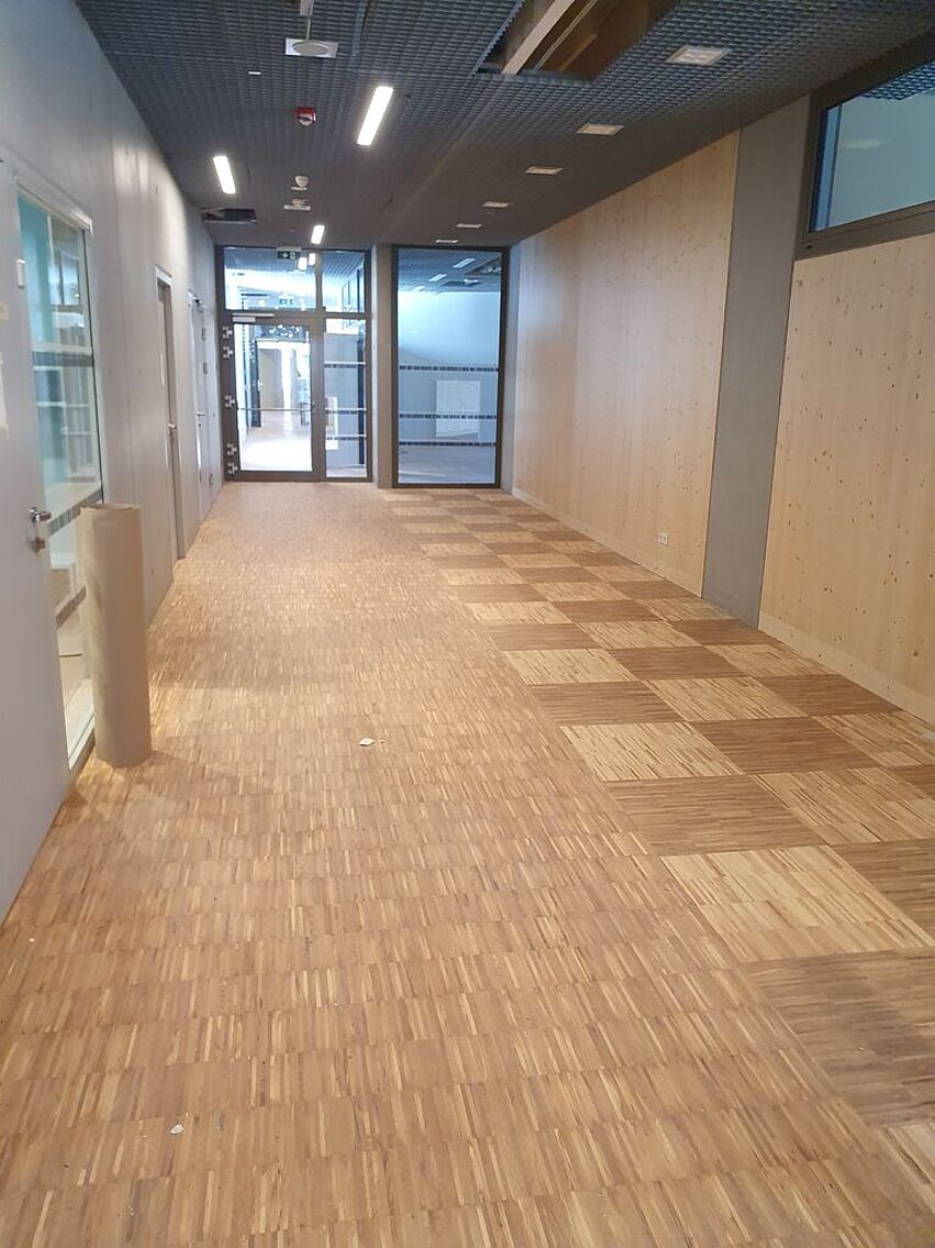 Great importance was attached to the use of wood products. Ecologically valuable, the interior of the educational facility impresses here with furniture made of simple solid spruce wood panels, because this material contains only little glue, is robust and easy to work with. This pleasant wood panelling can be found on all floors. Open spaces along the corridors offer enough room for recreational breaks and movement in between.