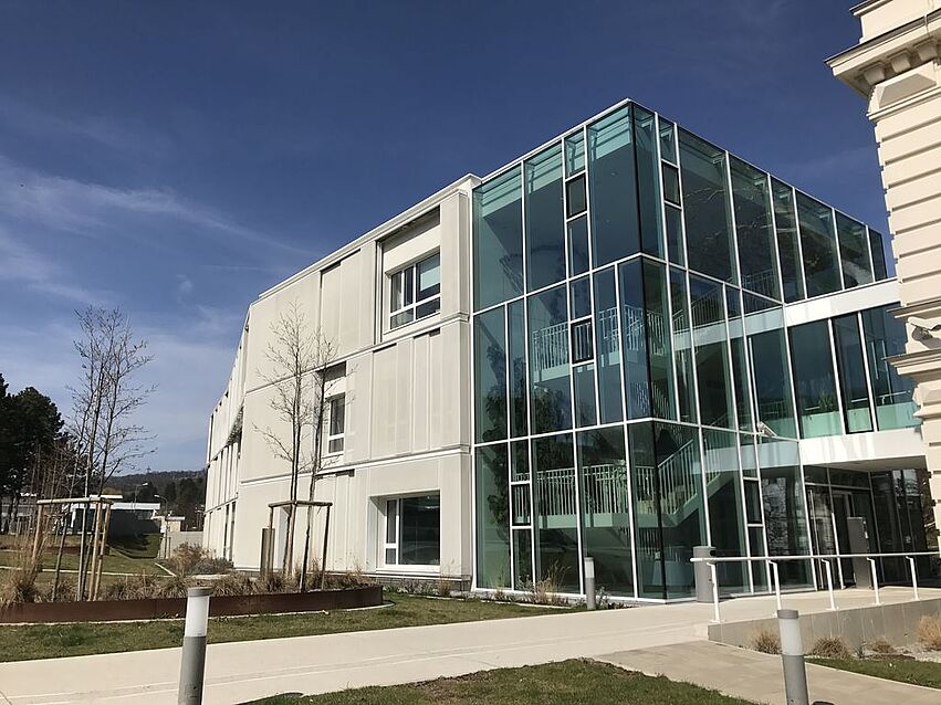 Space heating for building I07 is provided by the biomass-supplied local heating network located on the IST Austria site. The extremely low demand for service hot water is generated decentrally and directly electrically in order to minimise distribution losses. The cooling supply is provided by an air-conditioning chiller. Basic heating and cooling is provided in the offices via concrete core activation, while underfloor convectors (lounge) and radiators in corridor areas ensure sufficient heating load coverage in exposed areas. In the conference rooms and the lounge, additional wall induction outlets are provided for air cooling when the number of occupants is high. Outside operating hours or when the rooms are not occupied, the air volumes can be regulated to a minimum flow rate in an energy-saving manner. Highly efficient heat and moisture recovery (the main ventilation system of the office building is equipped with rotary heat exchangers) ensure excellent indoor air comfort with the lowest energy consumption. At the same time, the drive energy of the fans was also optimised The systems are designed for the smallest possible pressure loss (whereby particular emphasis was placed on demand-oriented air change rates, short duct systems, reduction of deflections, flow optimisation of the fittings and low air velocities in the system).