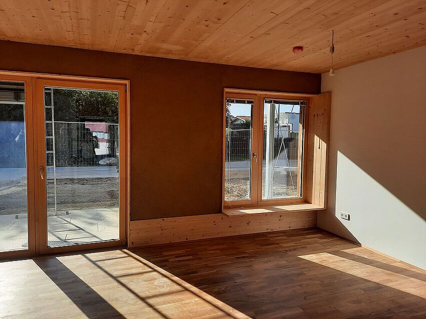 The wooden frame components with straw bale insulation for the outer walls are prefabricated in the hall and plastered with clay on the construction site. The excavation material available on site is examined in advance. If this turns out to be suitable, it will be used for plastering. This eliminates transport costs and emissions, besides clay is ideal for self-construction. The aim is to make the construction as recyclable as possible. This is an exciting challenge for both the planners and the companies involved!