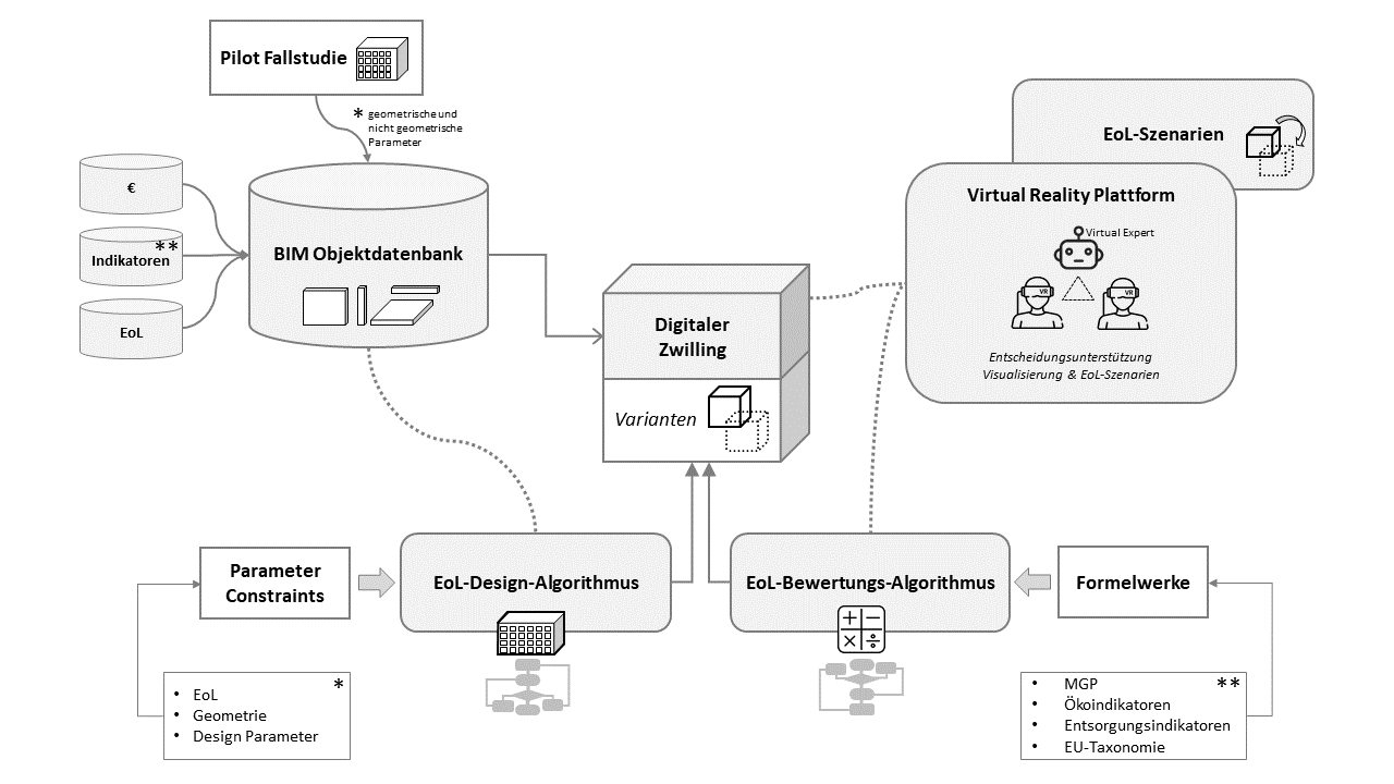 By visualizing the end-of-life (EoL) scenarios of the generated digital twins in a VR platform, including user interaction and variant generation, the decision-making process of the stakeholders involved in design and construction will be supported. The digital "Circular Twin" ecosystem thus enables the early implementation of the goals of the circular economy and sustainability as well as end-to-end digitization in the construction industry.