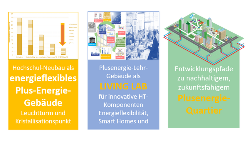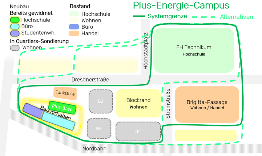 - Development of possible development scenarios for the neighbourhood into a "Plus-Energy-Campus" with the involvement of neighbourhood stakeholders
