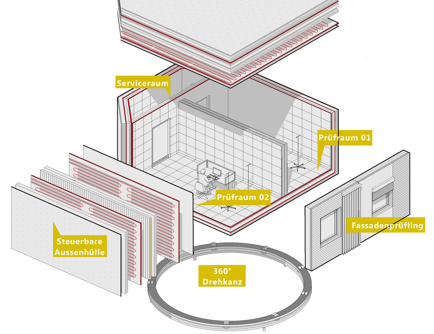 Die Prüfbox wird durch eine Massivholzkonstruktion gebildet, deren U-Werte im Bereich von 0,10 W/m²K liegen. Im Gegensatz zum üblichen Aufbau einer Gebäudehülle, lässt sich diese aber in zwei unterschiedlichen Ebenen temperieren. Die außenliegende Aktivierung dient dazu den Wärmestrom aus dem Innenbereich in allen Flächen - außer der Prüfebene - zu neutralisieren. Hierdurch wird quasi eine „unendlich starke“ Dämmung realisiert, da keine nennenswerten Wärmeverluste aus dem Innenbereich mehr auftreten. Die innere Aktivierungsebene dient einerseits zur exakten Bestimmung des Energieeintrags (oder -verlustes) und anderseits zur Simulation des gewünschten realen Verhaltens des gewählten Aufbaus.