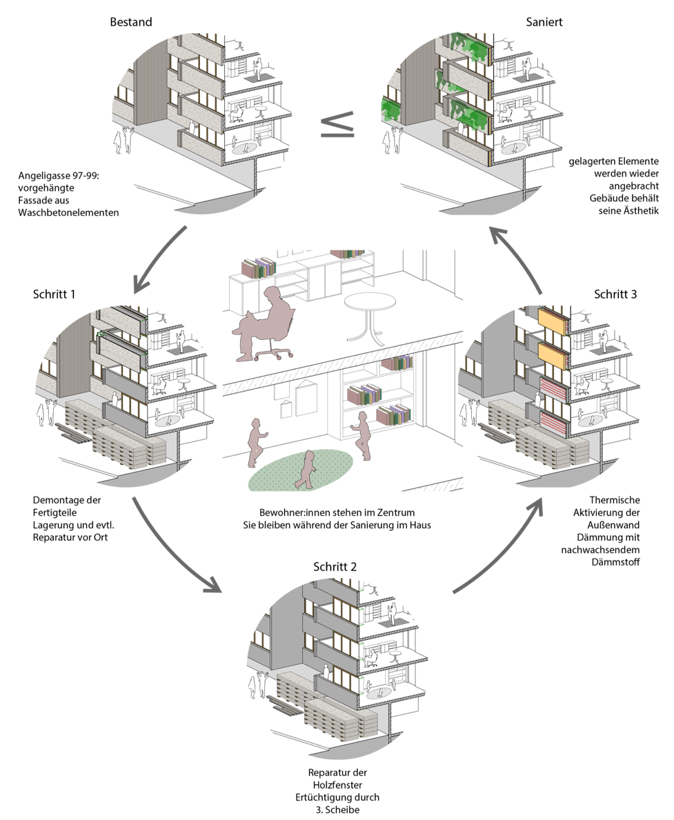 Das Sondierungsprojekt „Favorite Facade ReUse“ hat sich zum Ziel gesetzt, Sanierung und thermischen Ertüchtigung von Gebäuden mit vorgehängten Fassaden durch eine innovative, technologische Lösung zu erreichen. Bestehende Fassadenelemente werden weiterverwendet und zugleich die Fassadenkonstruktion in neuartiger Weise zur Beheizung, Begrünung und ev. als Gestaltungsfläche genutzt. Sanierung erfolgt von außen, Bewohner:innen sind aktiv eingebunden.