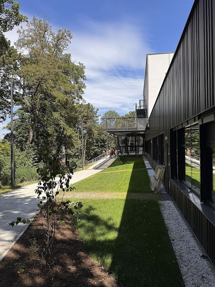 Am Vorplatz zur Roseggergasse wurde die vorhandene Hügelkuppe teilweise neu modelliert, um einen großzügigen, barrierefreien Zugang mittels Rampe auf das neue Erdgeschossniveau zu ermöglichen. Dabei wurde größtmögliche Rücksicht auf den bestehenden Baumbestand genommen, der in die neu geschaffenen Freiräume integriert wurde.