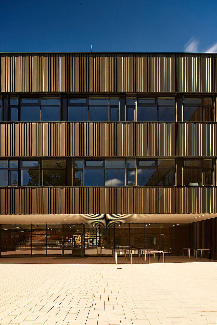 Der bestehende Schulkomplex des BG/BRG Perchtoldsdorf wurde umfassend saniert und durch einen Zubau erweitert. Die zur Umgebung orientierten Gebäudeseiten erhielten – sowohl bei neuen als auch bei bestehenden Bauteilen – eine einheitliche, hinterlüftete Fassade, um ein stimmiges Gesamtbild zu gewährleisten. Als Fassadenbekleidung kamen großformatige, trapezförmig gekantete Aluminium-Lochplatten zum Einsatz.