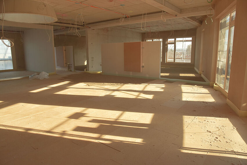 Auf 5.792 m2 wurden mit Baustoffen aus erneuerbaren Rohstoffen oder Recyclingmaterial graue Energie gespart und Schad- und Störstoffe vermieden. Baustoffe wie Lehm und Holz sorgen für gutes Raumklima und zukünftig für eine einfache Entsorgung. Deutlich sichtbar sind der Lehmputz und der geölte Parkettboden, aber auch das Darunter könnte sich sehen lassen: Holzweichfaserplatten als Dämmstoff im Bodenaufbau, darunter lehmummantelte Holzspäne. Hanffaserdämmung an den Außenwänden und in den Trockenbauwänden substituieren Bauprodukte aus nicht nachwachsenden Rohstoffen.