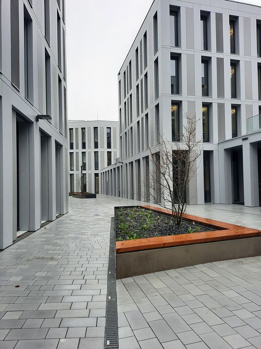 Das ausgezeichnete Ergebnis in der klimaaktiv-Zertifizierung spiegelt das Bestreben der Bauherrschaft wieder, einem überdurchschnittlichen ökologischen Anspruch gerecht zu werden. Von Beginn der Planung an wurden ehrgeizige Ziele, wie beispielsweise das Bauen im Passivhausstandard, definiert. Architektonisch wurde das aus vier im Erdgeschoß verbundenen Baukörpern bestehende Gesamtgebäude von den Architekt*innen als ein Zitat der bestehenden, kleinteiligen Campus- und Stadtstruktur verstanden. Auch wenn die Gesamtanlage durch eine stärkere Begrünung der durch die Bauteilkonfiguration entstandenen Freiräume profitiert hätte, erzeugt die Anordnung dennoch attraktive und spannende Blickachsen und wahrt die Maßstäblichkeit der Umgebung.