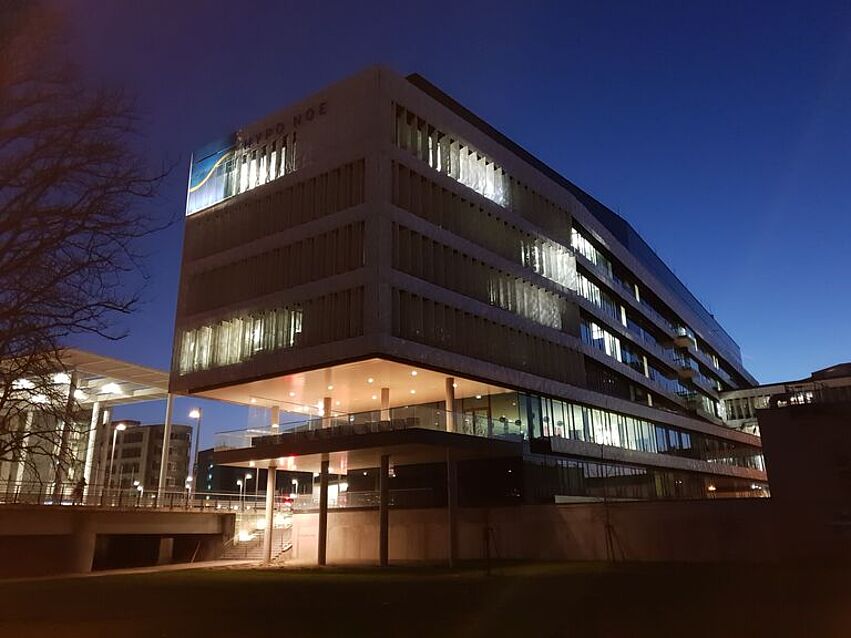 Die HYPO NOE-Konzernzentrale stellt ein Vorzeigeobjekt effizienter Energienutzung dar. Das Gebäude der Hypo Group schließt städtebaulich im Norden den Bereich des NÖ Regierungsviertels und liefert damit einen positiven städtebaulichen Beitrag im Stadtgefüge. Die Fassadengestaltung in Form von beweglichen perforierten Lochblechen lässt das Gebäude als weißen Monolith erscheinen. Dieser Kristall öffnet und schließt sich dem Sonnenstand und den Betriebszeiten entsprechend. Gleichzeitig entsteht dadurch ein tageszeitabhängig unterschiedliches, spannendes Erscheinungsbild.
