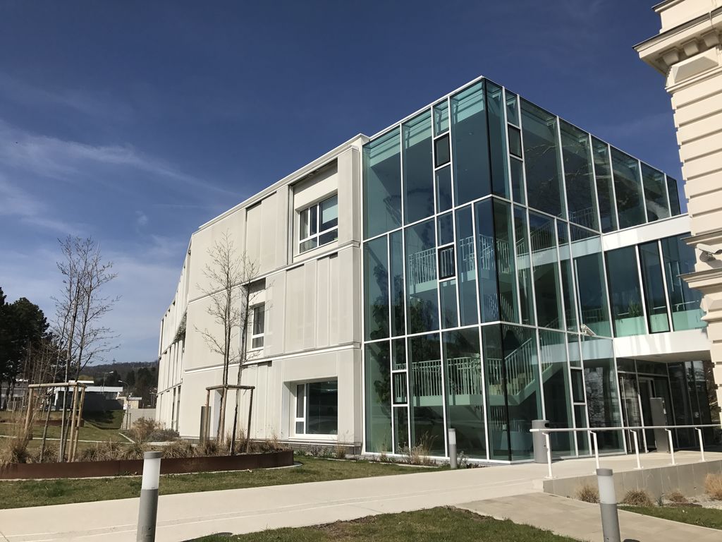 Die innere Erschließung wird durch die verglasten Gelenke des Baukörpers und durch Glasfelder neben den Bürotüren mit natürlichem Tageslicht versorgt. Die Sonnenschutzschiebeelemente können von den MitarbeiterInnen individuell gesteuert werden und erlauben ein abwechslungsreiches Fassadenbild. Die Lochfassade mit niedrigen Fensterparapeten - kombiniert mit ausgeklügeltem Sonnen- und Blendschutz - erlaubt ein Optimum an Tageslichtversorgung, Außensichtverbindung und ausgezeichneten Bildschirm-Arbeitsplatzbedingungen. Terrassen und eine Freilufttreppe im Westen stellen das Bindeglied zu den attraktiven Außenanlagen dar. Die Terrassen sind so ausgelegt, dass sie das Andocken der geplanten Verbindungsbrücke zum späteren Technologie Park ermöglichen. Im Untergeschoß sind Archive, Lager, Duschen, Haustechnikräume und die Kollektorverbindung untergebracht.