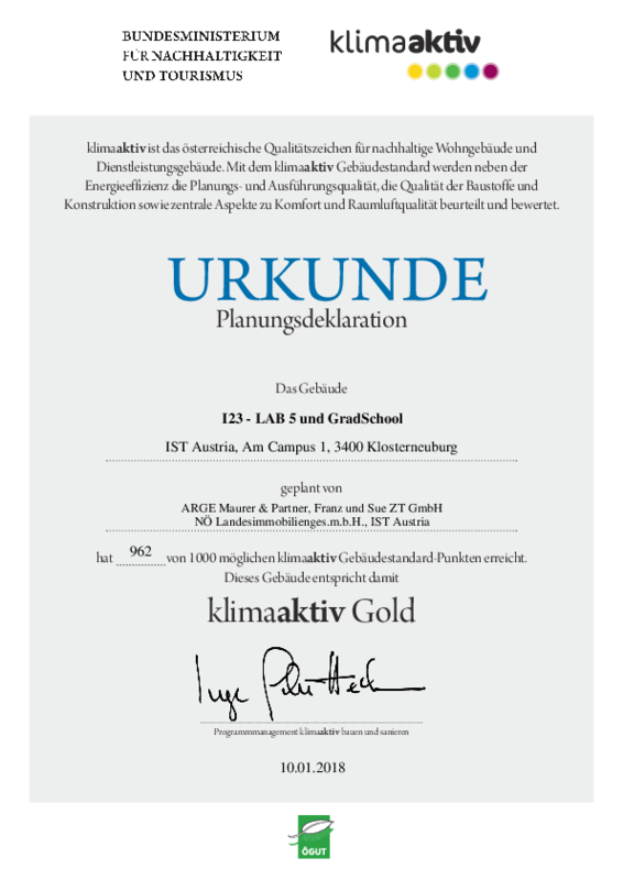 I23 umfasst Labors, einen angegliederten Lehrbereich (Graduate School) und eine Bibliothek mit Lernzonen. Hohe technische Standards treffen auf hocheffiziente Energieversorgung. Terrassen direkt zugänglich von den Bürobereichen, großzügige Freiraumbereiche und offene Kommunikationszonen stehen den ForscherInnen und StudentInnen zukünftig zur Verfügung. Der klimaaktiv-Gebäudestandard zeigt Qualitäten des nachhaltigen Bauens auch bei diesem Gebäude. Mit dem klimaaktiv Qualitätszeichen werden neben der Energieeffizienz die Planungs- und Ausführungsqualität, die Qualität der Baustoffe und Konstruktion sowie zentrale Aspekte zu Komfort und Raumluftqualität eines Gebäudes beurteilt und bewertet. Von klimaaktiv Bauen und Sanieren werden nur Gebäude in Österreich ausgezeichnet, die einer besonders hohen Qualität in diesen Bereichen entsprechen.