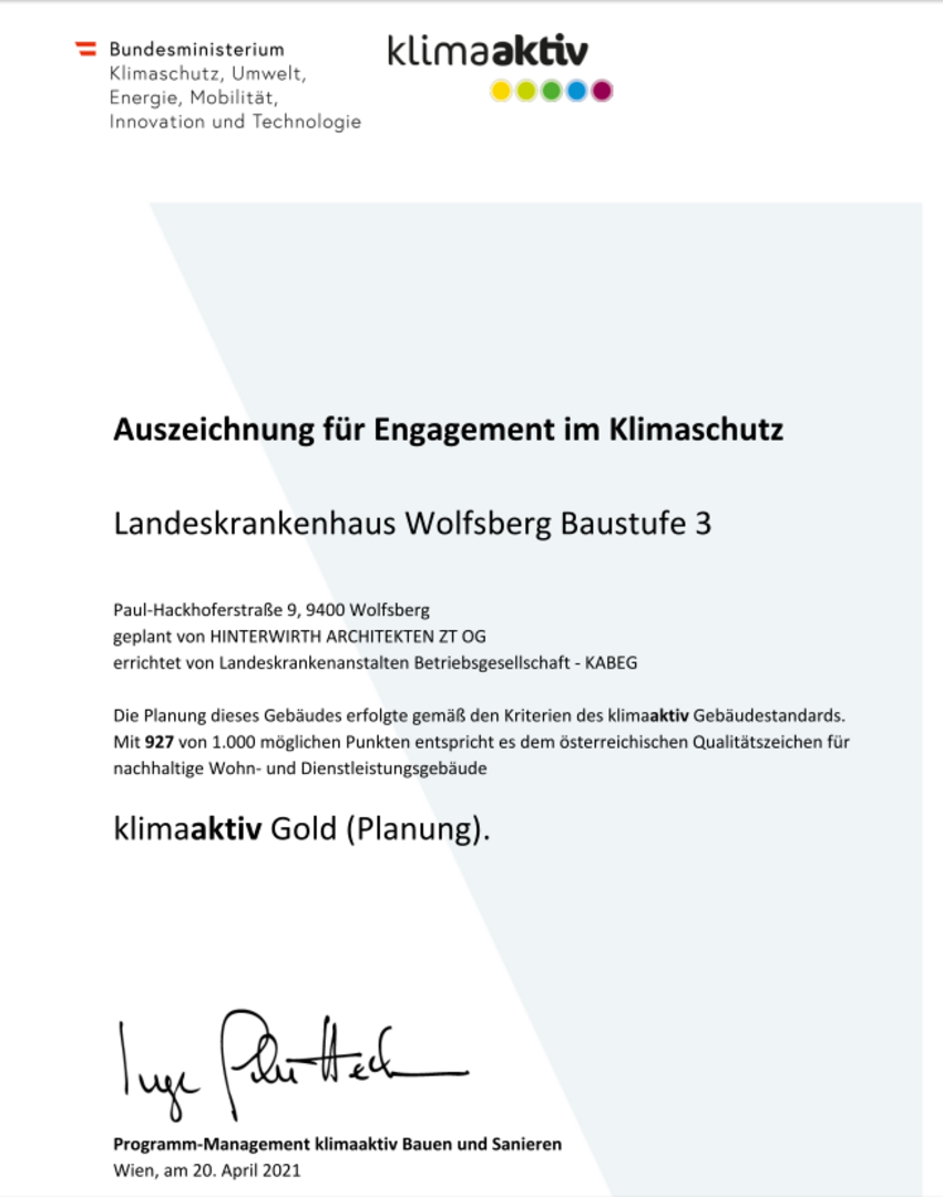 Der österreichische klimaaktiv-Gebäudestandard zeigt Qualitäten des nachhaltigen Bauens auch bei diesem Gebäude. Neben der Energieeffizienz werden die Planungs- und Ausführungsqualität, die Qualität der Baustoffe und Konstruktion sowie zentrale Aspekte zu Komfort und Raumluftqualität eines Gebäudes beurteilt und bewertet. Von klimaaktiv Bauen und Sanieren werden nur Gebäude ausgezeichnet, die einer besonders hohen Qualität in diesen Bereichen entsprechen.