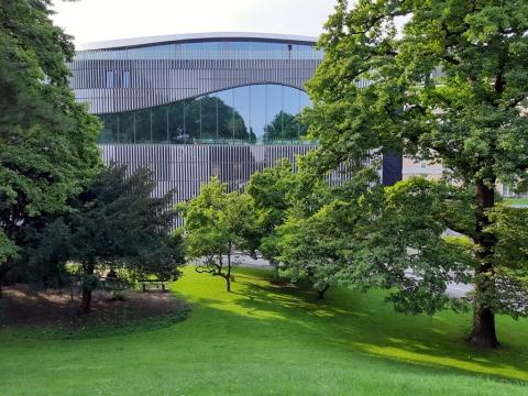 Der Neubau eines Bad- und Kurhauses beim Mirabellgarten gelegen bietet einen Ausblick auf die Salzburger Innenstadt und den Kurpark.