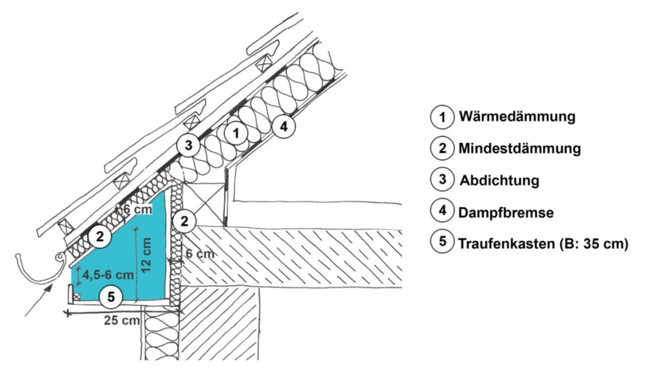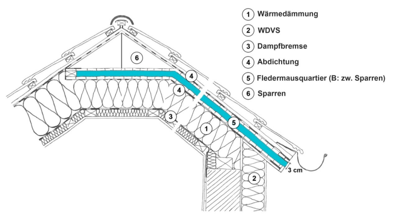Die unauffälligere und auch kostengünstigere Variante sind Traufkästen, die im Dachaufbau berücksichtigt werden. Dabei wird eine zusätzliche 3 Zentimeter hohe Luftschicht zwischen den Sparren für die Fledermäuse eingeplant. (vgl. Abb. 6). Um das Eindringen von Wasser in die Wärmedämmung zu verhindern, ist es sinnvoll, ober- und unterhalb des Fledermausquartiers eine diffusionsoffene Abdichtung anzubringen. [8]