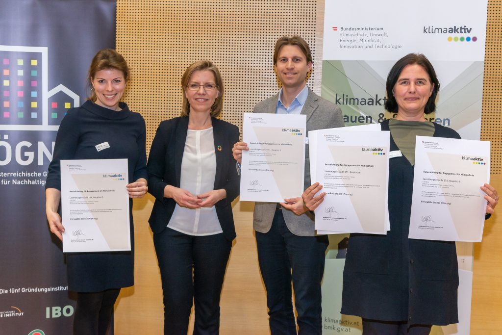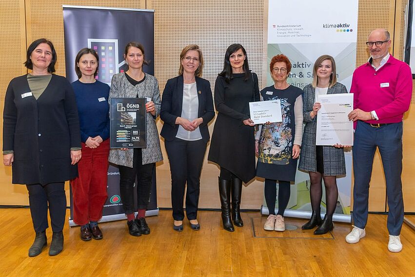 Im Rahmen des BauZ! 2020 wurden von der Österreichischen Gesellschaft für Nachhaltiges Bauen (ÖGNB) und klimaaktiv Bauen und Sanieren herausragende Projekte ausgezeichnet - darunter einige Projekte mit IBO-Beteiligung. Insgesamt 31 nachhaltige Gebäude bekamen von Leonore Gewessler, Bundesministerin für Klimaschutz, Umwelt, Energie, Mobilität, Innovation und Technologie, ein Zertifikat überreicht.
