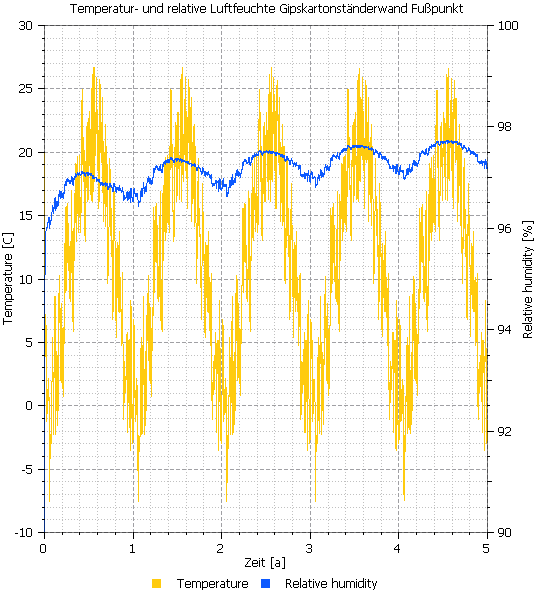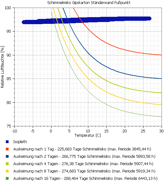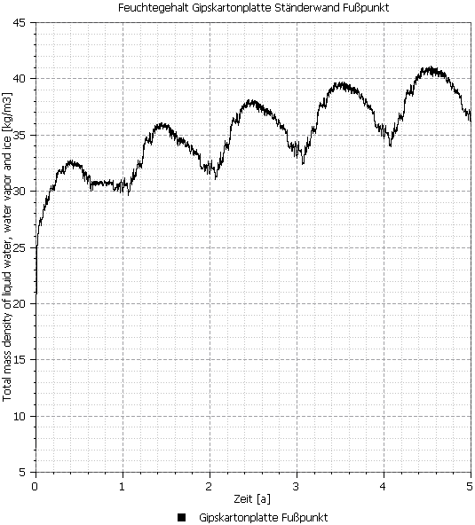 Wird die Konstruktion nun im Zeitverlauf analysiert – d.h. Auffeuchtungs- und Trocknungseffekte unter ‚realen‘ Klimarandbedingungen und unter Berücksichtigung der materialspezifischen Speicher- und Transportmechanismen über mehrere Jahre hinweg betrachtet, so zeigt sich wie in Abbildung 5 dargestellt, eine auf Flankendiffusion über die Ständerwand zurückzuführende Feuchteakkumulation am Fußpunkt der Ständerwand. Dies führt – dauern die kritischen Feuchtezustände zu lange an – zu einem Schimmelpilzwachstum (Abbildung 3) an der Gipskarton bzw. Gipsfaserplatte und resultiert in einem (gut) verdeckten – weil nicht sofort ersichtlichen, und nicht unbedingt naheliegenden, aber oft großflächigen – Schimmelschaden.