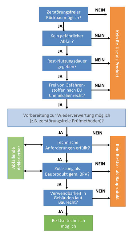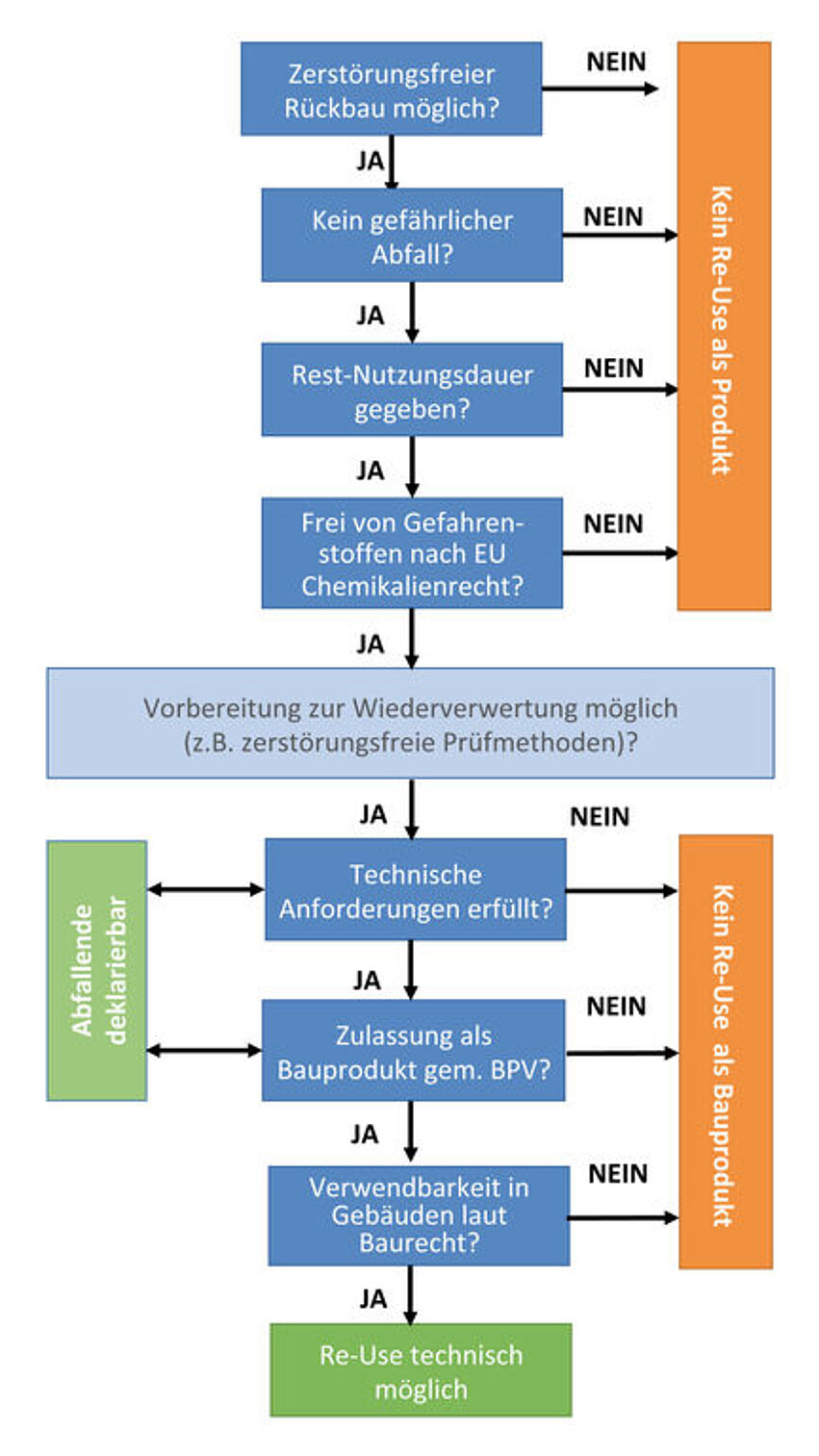 1) Hinweis zu Abbildung 2: Vorbereitungsmaßnahmen zur Wiederverwendung (wie Prüfung, Reparatur, ggf. sogar weiterführende Aufbereitungsschritte) können für bestimmte Produktgruppen notwendig sein, müssen aber nicht zwingend erforderlich werden (in Einzelfällen ist Re-Use ohne weitere Maßnahmen möglich). Daher ist dieses Kriterium nur eine Kann-Bestimmung (in hellblau). Zerstörungsfreie Prüfmethoden sind in Bezug auf eine hohe Wiedergewinnungsquote von rückgebauten Baustoffen und -elementen wesentlich und bestimmen letztlich auch die Wirtschaftlichkeit von Wiederverwendung. Bei ggf. (teil)zerstörenden Prüfungen ist mit reduzierten Materialmengen zu rechnen, in Abhängigkeit wie viele Elemente für repräsentative Prüfungen herangezogen werden müssen.
