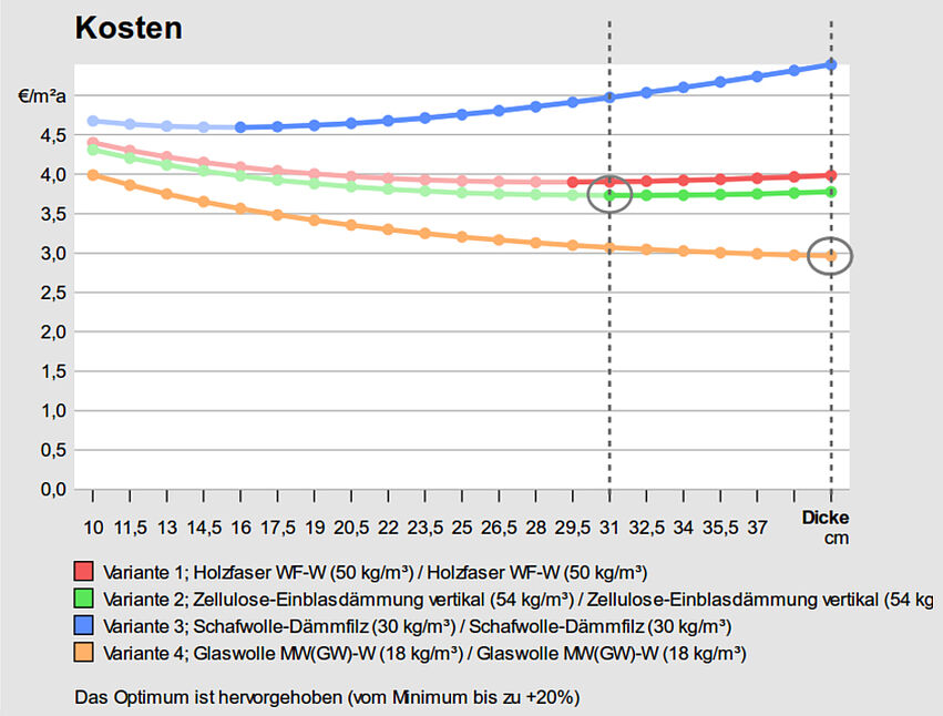 Die Auswertung kann unter verschiedenen Gesichtspunkten geschehen, sich beispielsweise in einem ersten Schritt an den Kosten orientieren. Diesem Ansatz folgend wäre der kostengünstigste Dämmstoff mit seiner entsprechenden ökologisch optimalen Dicke auszuwählen, im vorliegenden Beispiel nach Abbildung 1 also eine 40 cm dicke Glaswolledämmung mit Kosten von ca. 3 EUR/m²a. Das nächstgünstigere Produkt ist Zelluloseeinblasdämmung mit Kosten von ca. 3,75 EUR/m²a bei einer ökolgisch optimalen Schichtdicke von 31 cm.