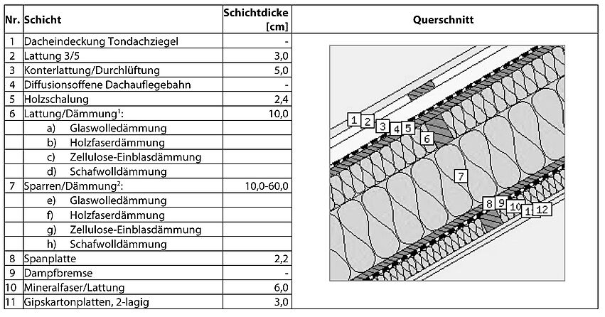 Am Beispiel eines Steildachaufbaus wurden für verschiedene Dämmmaterialien der ökologische und der Kostenaufwand für Errichtung und Betrieb ermittelt. Tabelle 2 zeigt den Aufbau der Konstruktion.