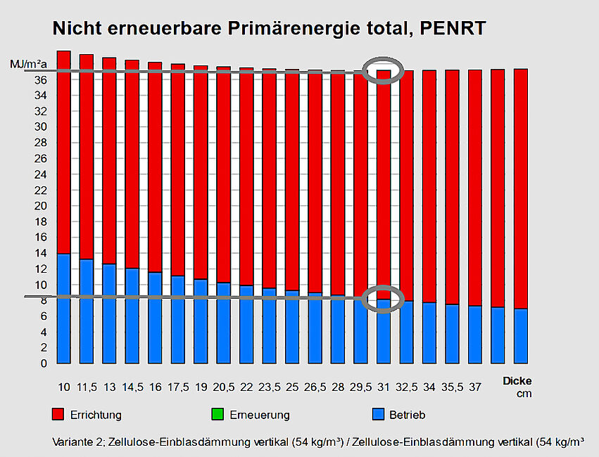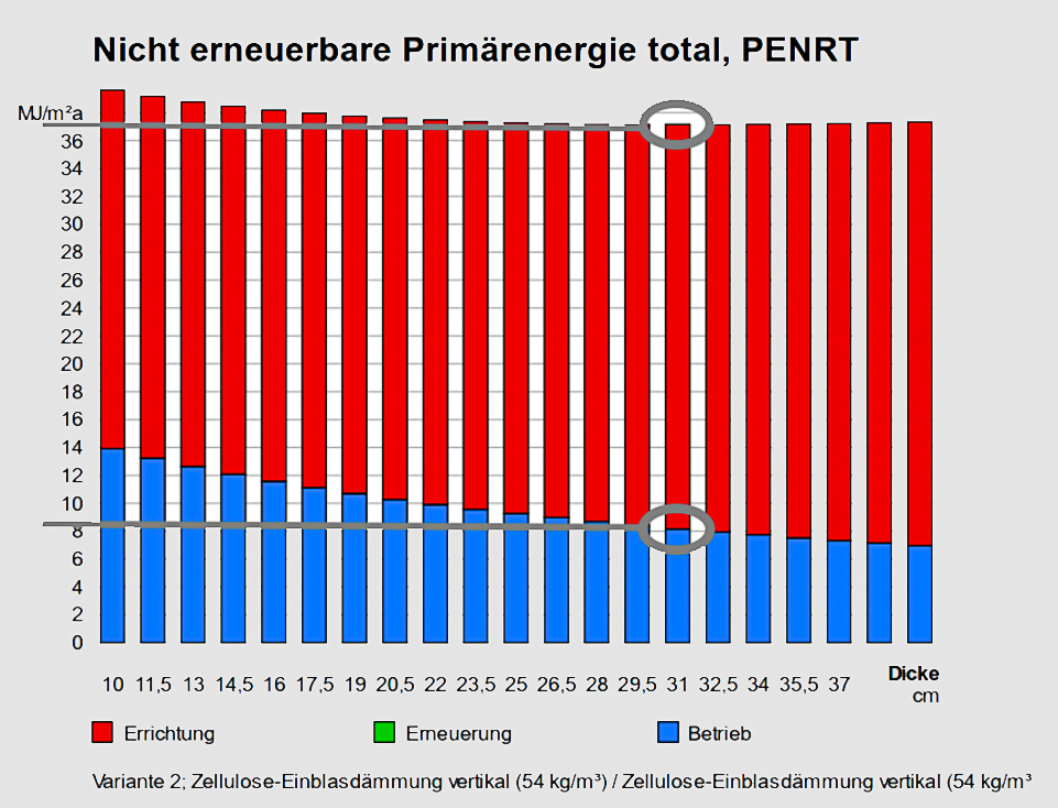 Erweitert man den Auswahlrahmen um die ökologischen Faktoren, zeigt sich nach Abbildung 2, dass mit einer rein kostenorientierten Auswahl ein erhöhter Ressourcenverbrauch einhergeht. Konkret bedeutet die Verwendung von 40 cm Glaswolle einen Bedarf an nicht erneuerbarer Primärenergie von ca. 44 MJ/m²a gegenüber etwa 37 MJ/m²a beim Einsatz von Zellulose-Einblasdämmung