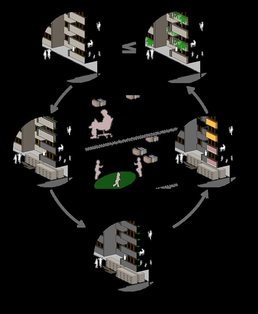 Zurzeit erfolgen Fassadensanierungen üblicherweise mittels Wärmedämmungsverbundsystemen (WDVS) mit nicht nachhaltigen Dämmstoffen. Vorgehängte Fassadenelemente aus Waschbeton oder Metallblechen werden demontiert und gemeinsam mit den Fenstern entsorgt. Transporte und Deponierung belasten die Umwelt und wertvolle Ressourcen dieser hochwertigen und für die Weiternutzung geeigneten Baumaterialen gehen verloren. Neue Materialien (Herstellung, Lieferung, Einbau) tragen zusätzlich zum CO2-Ausstoß bei.