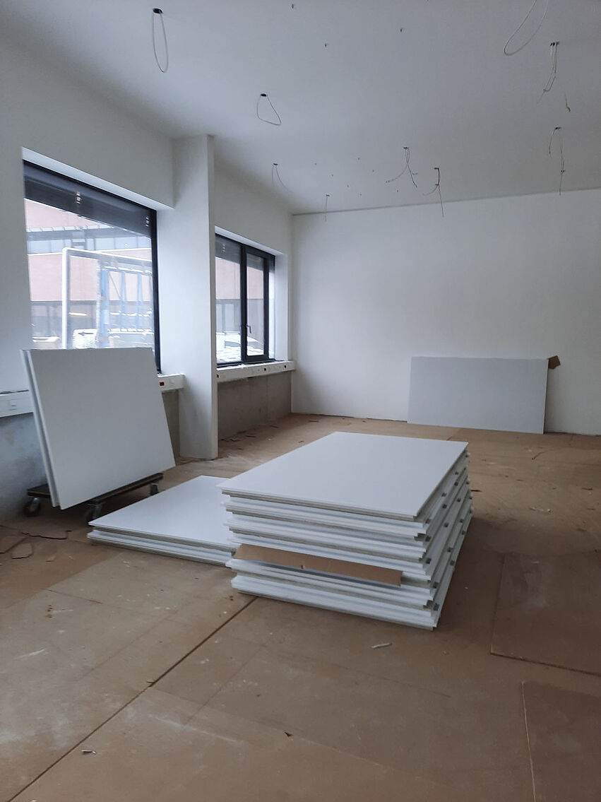 Schon im Oktober 2017 wurde begonnen auch über die Produkte, die eingesetzt werden sollten, nachzudenken und sie auf ihre ökologischen Eigenschaften hin abzuklopfen. Akustik-Platten, Bodenbeschichtungen, WhiteBoardfarbe und Fassadenelemente wurden schon in der Planung überprüft, in die Leistungsverzeichnisse wurden die genauen Anforderungen gewerkespezifisch integriert. Gerade die Beschichtung von Estrichen, auch Industrieboden genannt, wird gerne mit Epoxidharzen durchgeführt. Die reaktiven Ausgangsstoffe sind gesundheitsgefährdend für diejenigen, die diese Produkte verarbeiten müssen. Mittlerweile gibt es Alternativen auf Wasserglasbasis, die in mehrfachen Schichten oft mit Epoxid- und PU-Harzen als Untergrund oder Deckschichten angeboten werden. Letztendlich wurde der derzeit wohl nachhaltigste Aufbau mit minimalen Mengen von PU-Harz in Kooperation mit Planung, Bauherr*in und der ausführenden Firma umgesetzt werden.