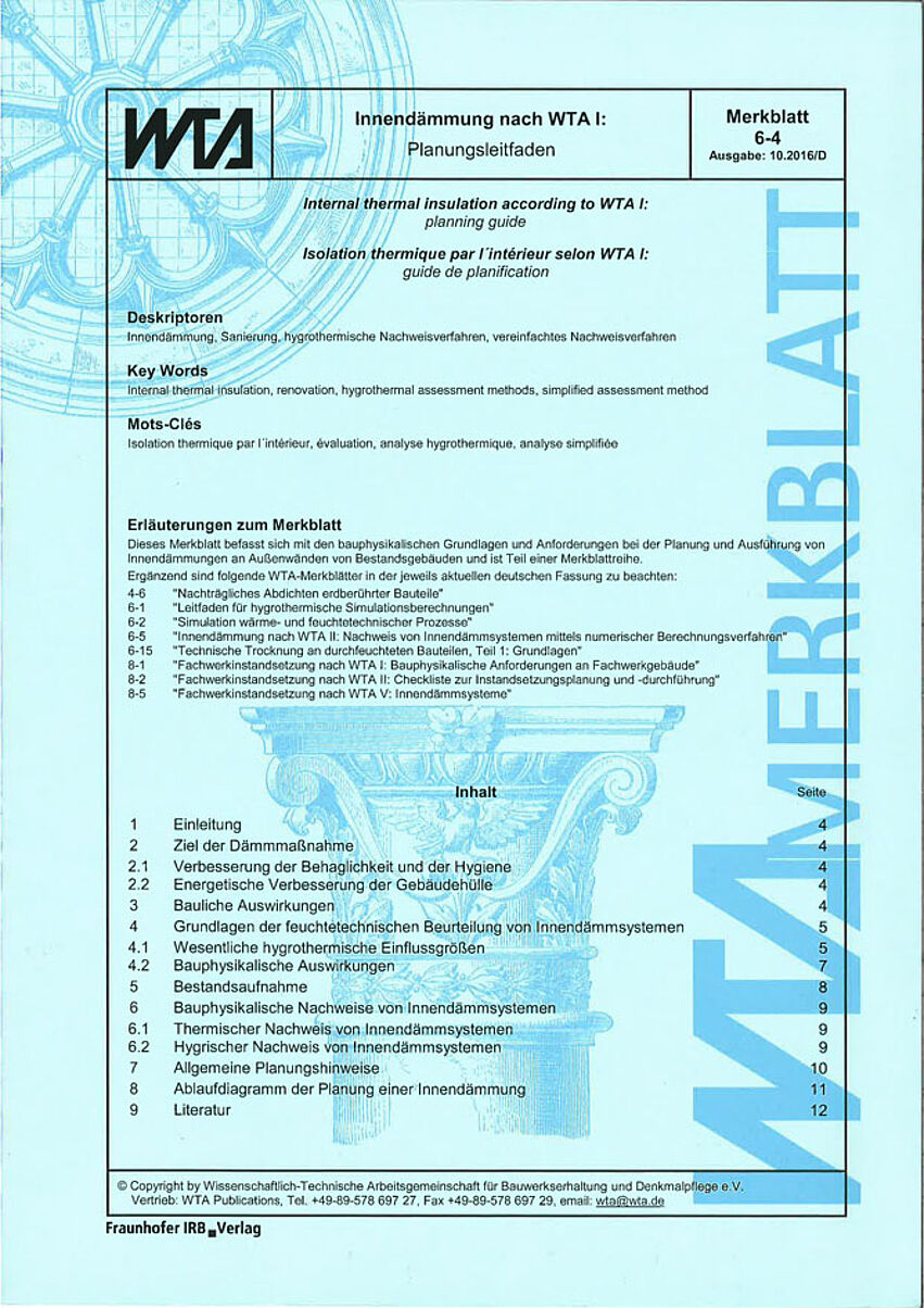 Das vorliegende Merkblatt ist Teil einer Merkblattreihe, die diesen besonderen feuchtephysikalischen Aspekten Rechnung trägt. Es werden allgemeine Planungshinweise gegeben und mögliche Gefährdungen definiert und beschrieben. Zur vollständigen Beurteilung einer Dämmmaßnahme auf der Innenseite einer Außenwand ist ein feuchteschutztechnischer Nachweis unabdingbar, damit Folgeschäden vermieden werden.
