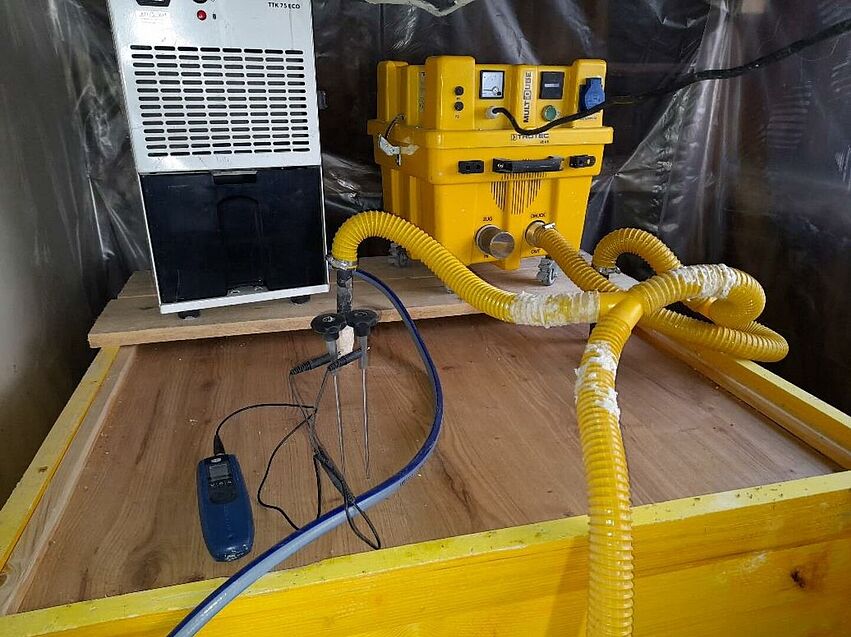 Im Rahmen eines Projekts des Lehrgangs „Sanierung und Revitalisierung“ an der Universität für Weiterbildung in Krems wurde untersucht, wie sich unterlassene Trocknungsmaßnahmen und das Nichtbeheben der Schadensursache auf die Gesamtsanierungskosten über die Lebensdauer einer Decke auswirken. Grundlage der Untersuchung war ein Versuchsaufbau in historischer Bauweise mit angrenzender Schüttung, bei dem ein solcher Wasserschaden simuliert wurde. Dabei wurden die Feuchtigkeitsentwicklung und ihre Auswirkungen messtechnisch erfasst (Abbildung 2). Im zweiten Schritt wurden Materialproben im Labor analysiert (Abbildung 3). Die Ergebnisse wurden jeweils im direkten Vergleich mit und ohne technische Trocknung ausgewertet.