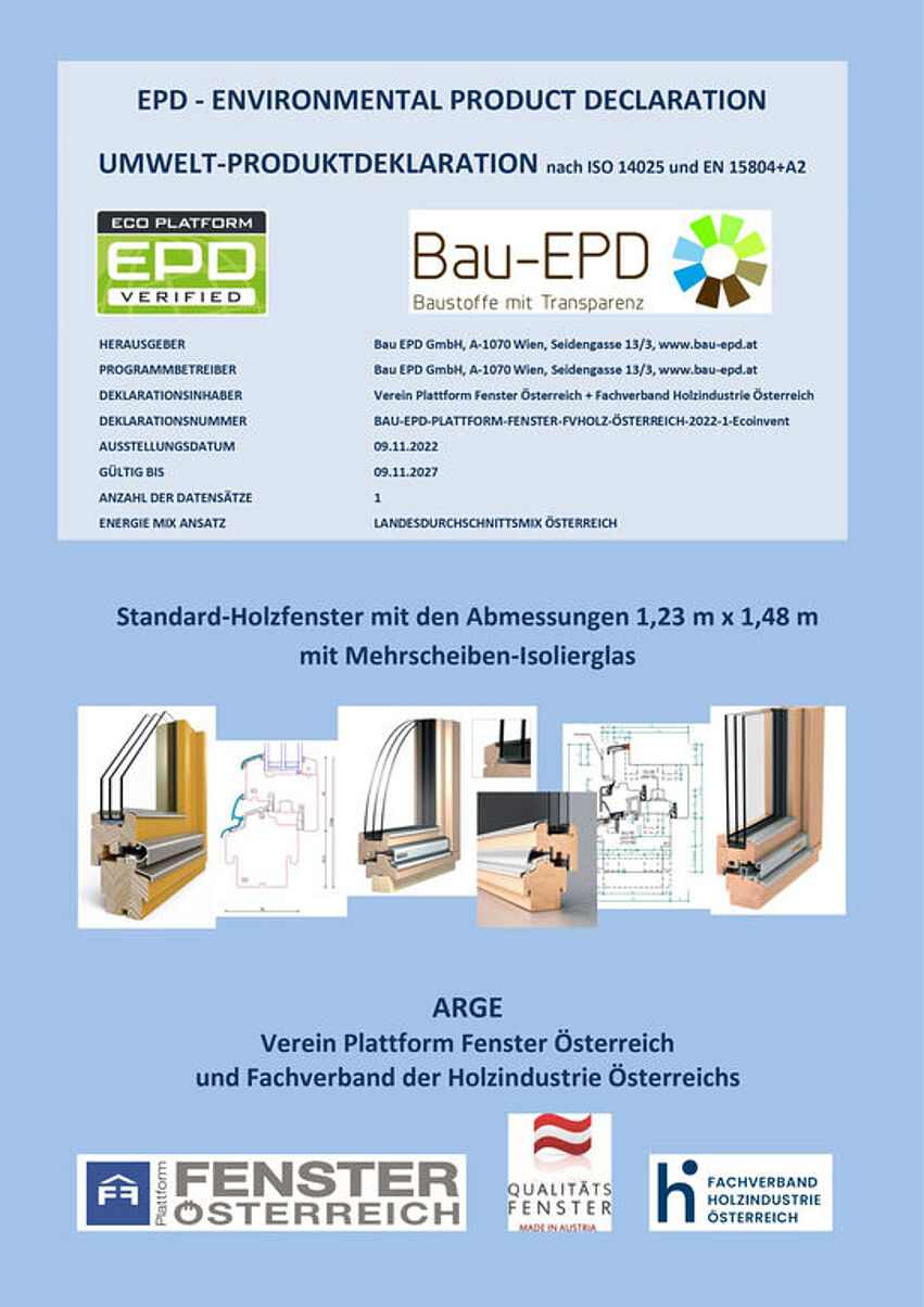 Die komplette EPD für das Standard-Holzfenster der ARGE Plattform Fenster Österreich und dem Fachverband Holzindustrie Österreich ist auf der Homepage der Bau EPD publiziert.