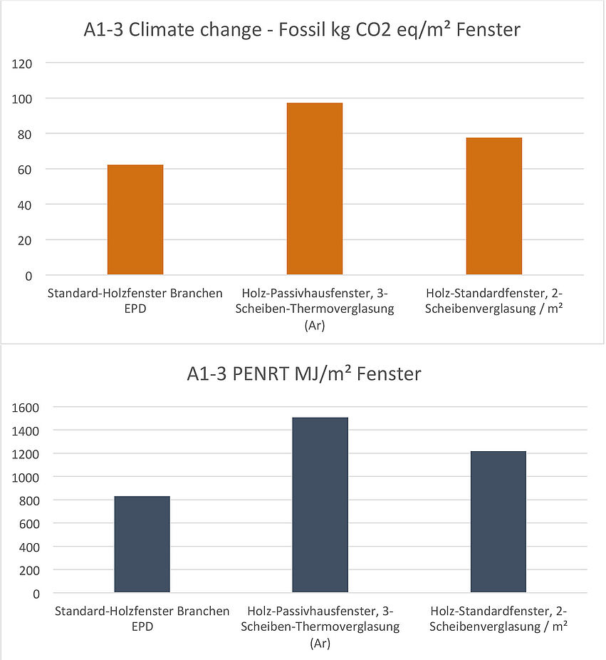 In den Abbildungen 1 + 2 werden die Resultate der Branchen EPD für das Standard-Holzfenster mit den baubook Referenzwerten für ein Holz-Passivhausfenster mit 3-Scheibenverglasung und ein Holz-Standardfenster mit einer 2-Scheibenverglasung verglichen. Die aktuellen, sehr detailliert bilanzierten Daten des Standard-Holzfensters der österreichischen Branchen-EPD zeigen ein deutlich positiveres Bild der Umweltauswirkungen als die Referenzdaten für Fenster, die basierend auf anerkannten Berechnungsmethoden und Datengrundlagen in der baubook-Datenbank hinterlegt wurden.