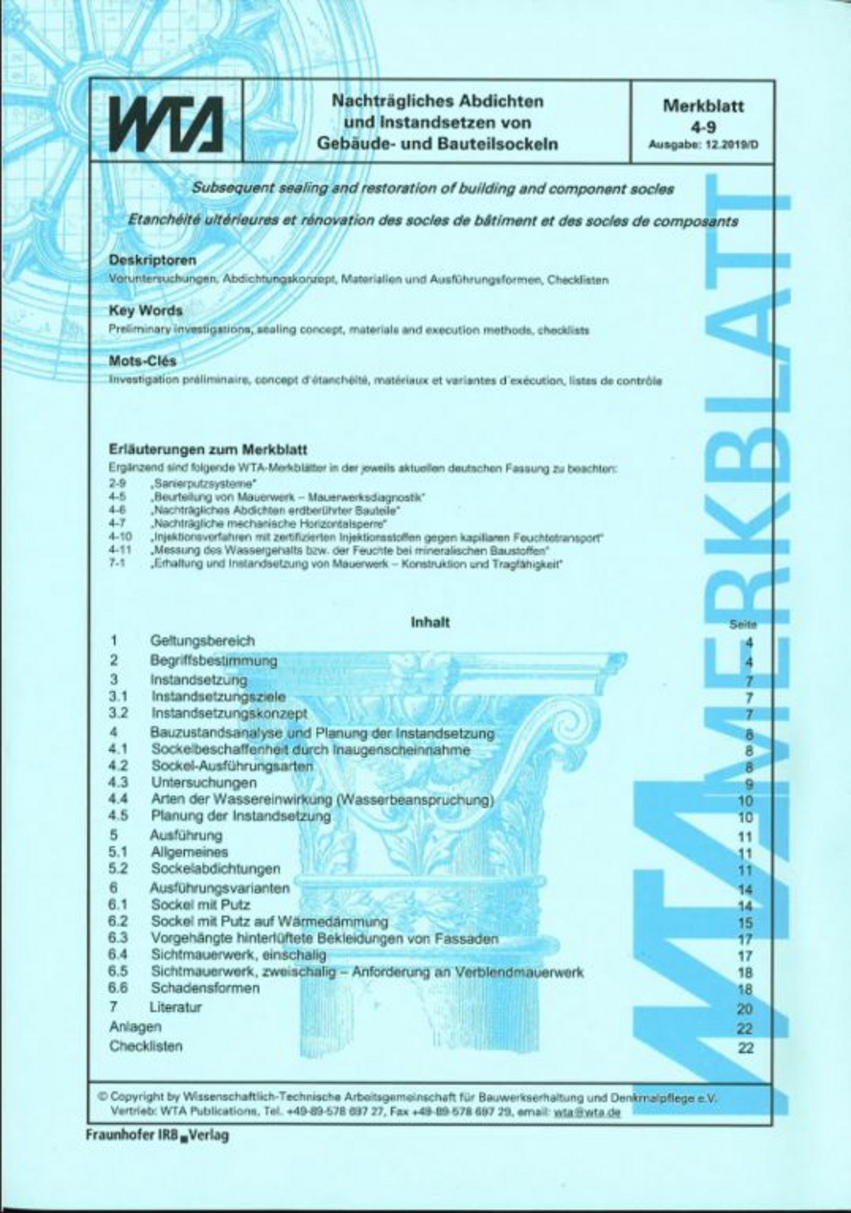 WTA Merkblatt E-4-9 (Ausgabe 12.2019/D) - Nachträgliches Abdichten und Instandsetzen von Gebäude- und Bauteilsockeln