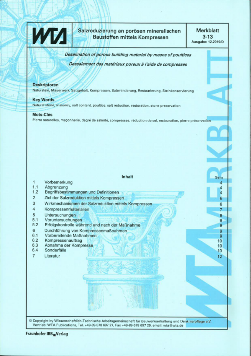 WTA Merkblatt 3-13 (Ausgabe: 12.2019/D) - Salzreduzierung an porösen mineralischen Baustoffen mittels Kompressen