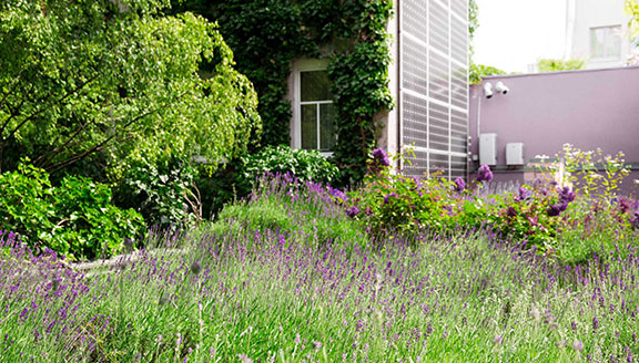 Auch mit den heute normgerechten Aufbauten wird beim Intensivdach, übers Jahr gerechnet, 90 % des Niederschlags gespeichert. Die Verdunstung kühlt die Umgebung ebenso wie die darunterliegenden Räume. Dennoch muss ein Intensivdach bewässert werden, am besten automatisch, damit das wertvolle Wasser so effizient wie möglich zu den Pflanzen gebracht wird.