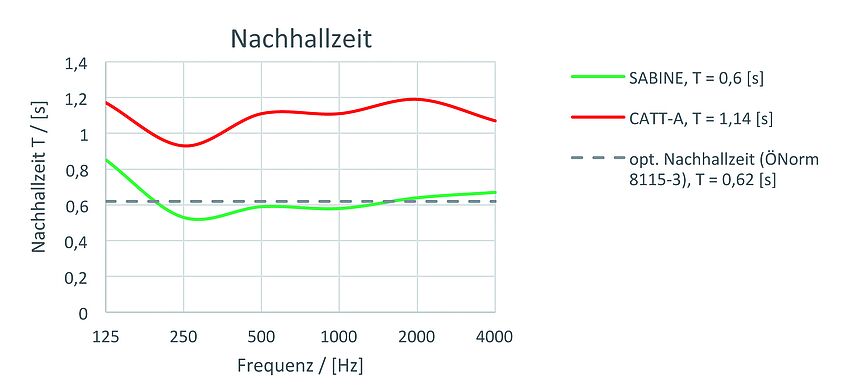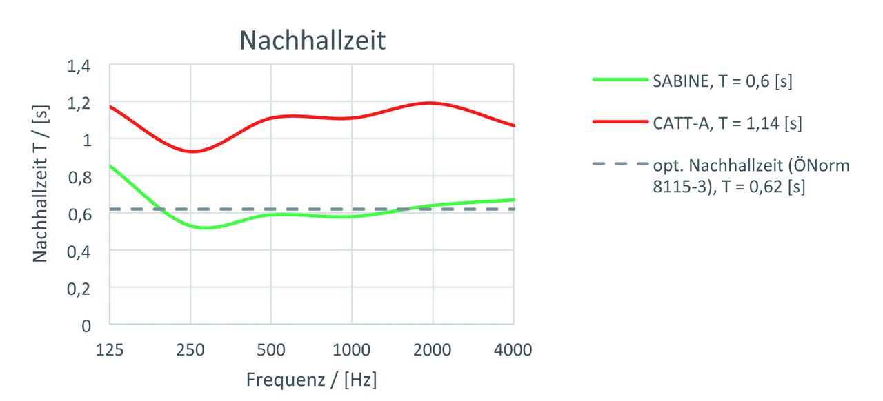 Wie mit einer detaillierteren Berechnung mittels CATT-Acoustic unter Berücksichtigung der Lage und Beschaffenheit der Oberflächen im Raum gezeigt werden kann, ergibt sich tatsächlich eine etwa doppelt so hohe Nachhallzeit von T = 1,14 s (Abb. 3).