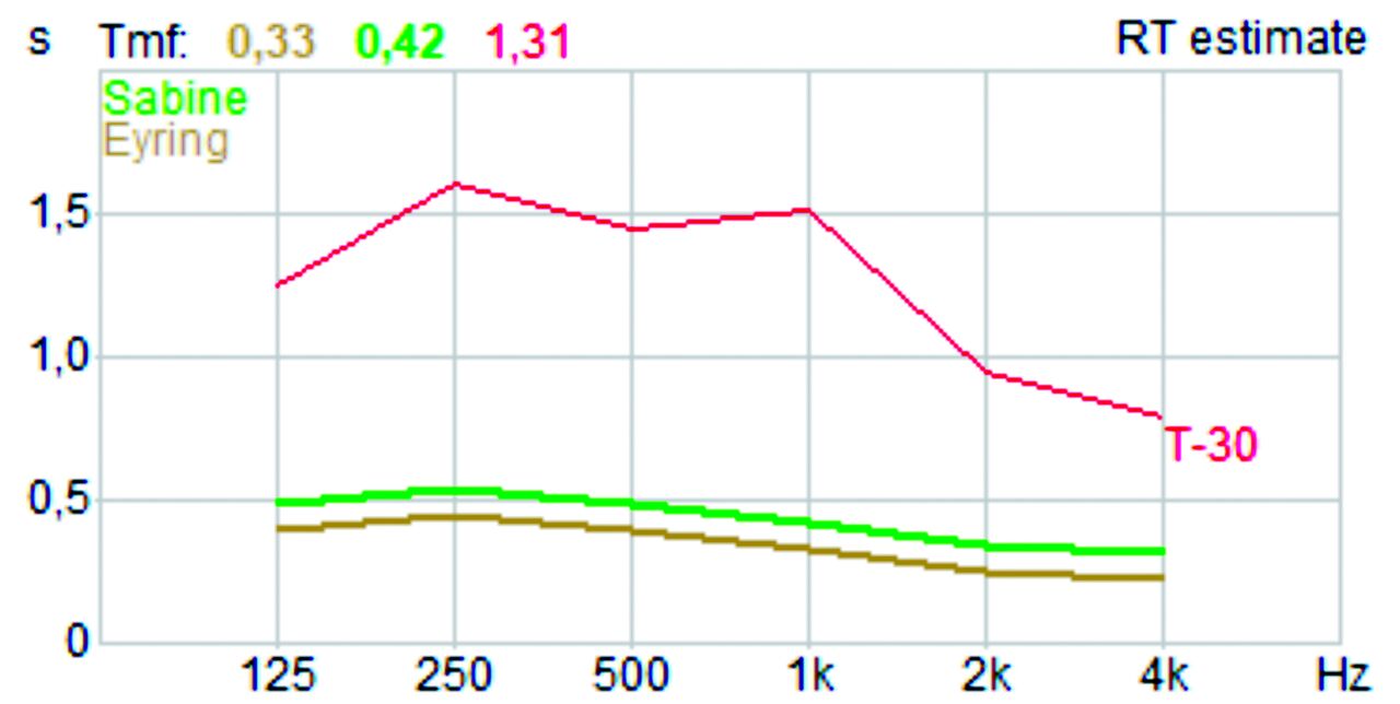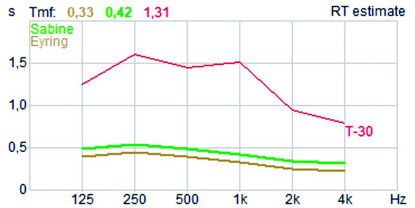 Gemäß SABINE wäre eine Nachhallzeit T = 0,42 s zu erwarten. Die rechtlichen Anforderungen (T < 0,7 s) sind scheinbar nachgewiesen. Tatsächlich liegt die Nachhallzeit aber bei T = 1,31 s und damit deutlich außerhalb der geforderten Qualitäten.