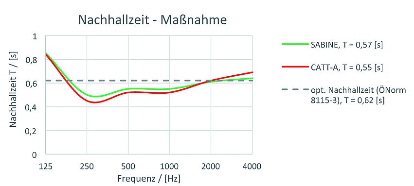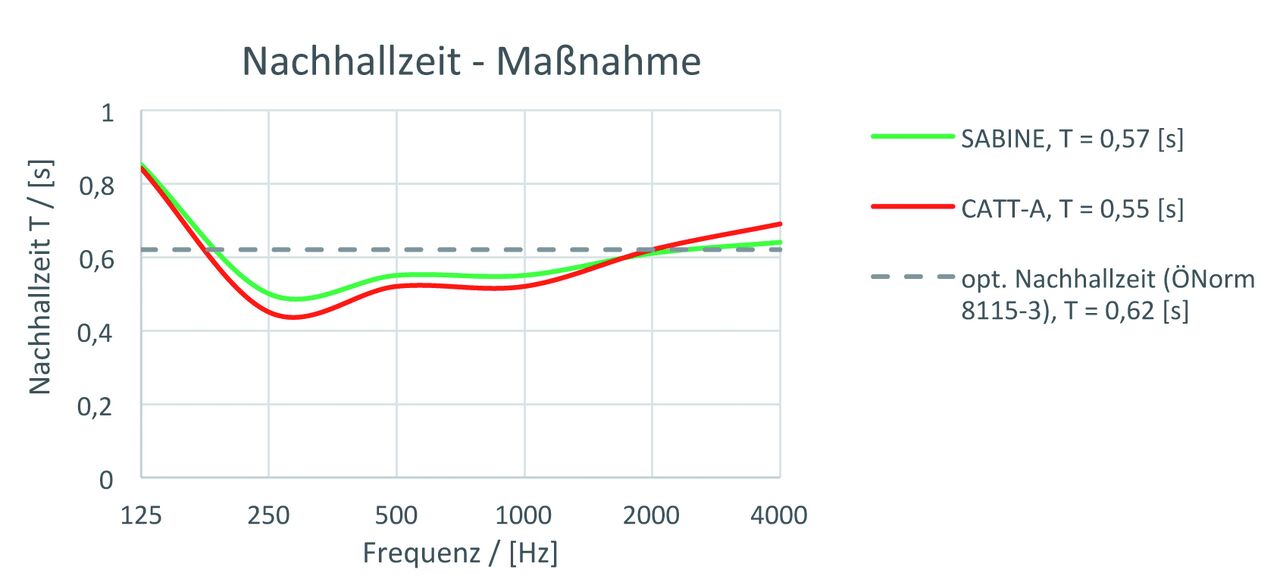 Die aus der Nutzung und dem Raumvolumen abgeleitete anzustrebende Nachhallzeit ergibt sich zu T = 0,62 s [1]. Bei einer reinen akustischen Aktivierung der Decke könnte über die Formel von SABINE eine mittler Nachhallzeit von T = 0,163*294/80 = 0,60 s erreicht werden. Die Anforderungen an die Nachallzeit wären somit erfüllt.