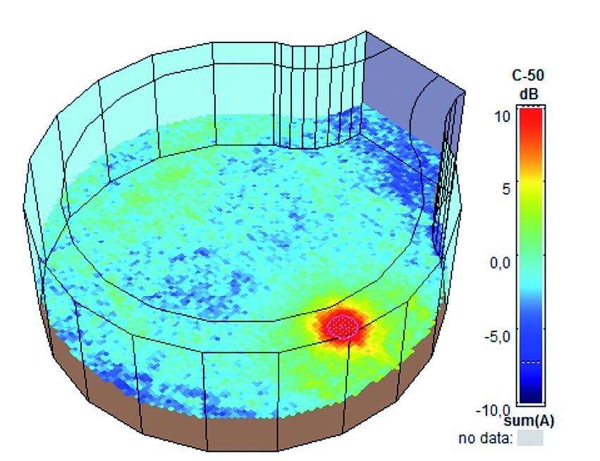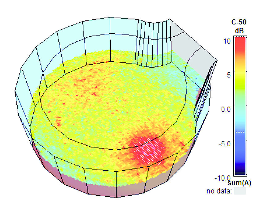 Dieser Effekt spiegelt sich auch in der Auswertung des Deutlichkeitsmaßes D50 wider. Als Zielwert für akzeptable Sprachverständlichkeit sollte ein Deutlichkeitsmaß D50 > 0,0 erreicht werden.