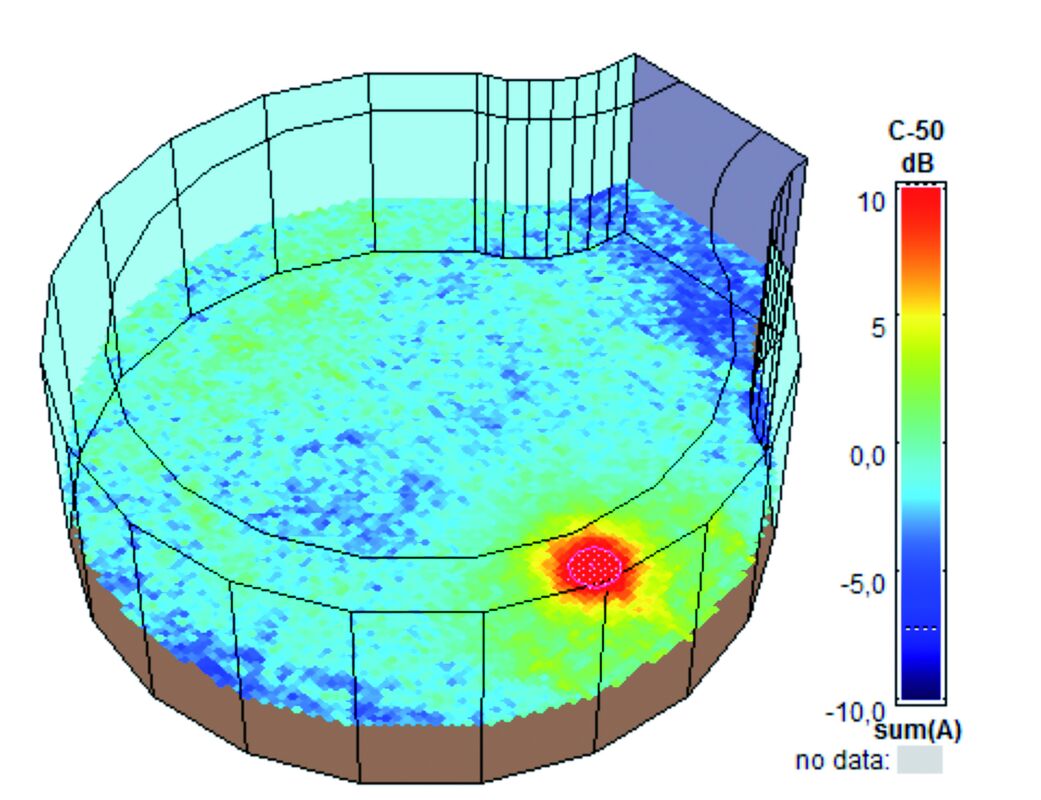 Ein besonderes Beispiel stellt ein jüngst in unserem Team bearbeiteter, kreisrunder Konferenzraum (Abb. 2) dar. Durch die konkav gekrümmte Fassade ergeben Fokussierungseffekte, welche sich besonders ungünstig für den akustischen Komfort im Raum auswirken.