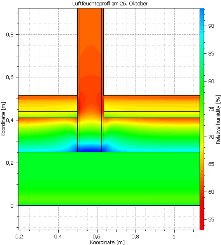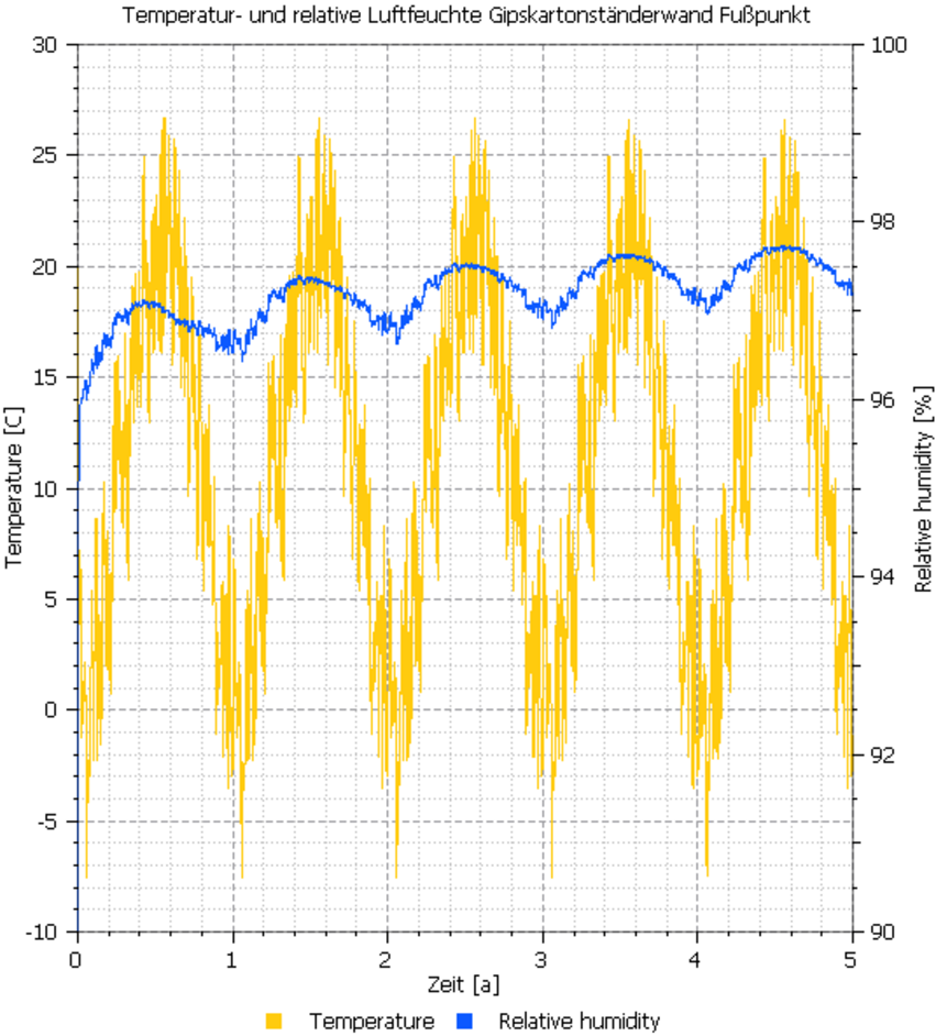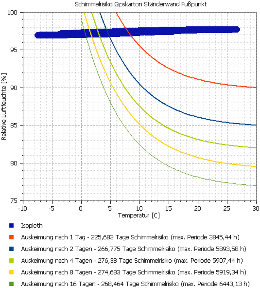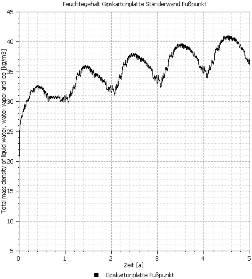Wird die Konstruktion nun im Zeitverlauf analysiert – d.h. Auffeuchtungs- und Trocknungseffekte unter ‚realen‘ Klimarandbedingungen und unter Berücksichtigung der materialspezifischen Speicher- und Transportmechanismen über mehrere Jahre hinweg betrachtet, so zeigt sich wie in Abbildung 5 dargestellt, eine auf Flankendiffusion über die Ständerwand zurückzuführende Feuchteakkumulation am Fußpunkt der Ständerwand. Dies führt – dauern die kritischen Feuchtezustände zu lange an – zu einem Schimmelpilzwachstum (Abbildung 3) an der Gipskarton bzw. Gipsfaserplatte und resultiert in einem (gut) verdeckten – weil nicht sofort ersichtlichen, und nicht unbedingt naheliegenden, aber oft großflächigen – Schimmelschaden.