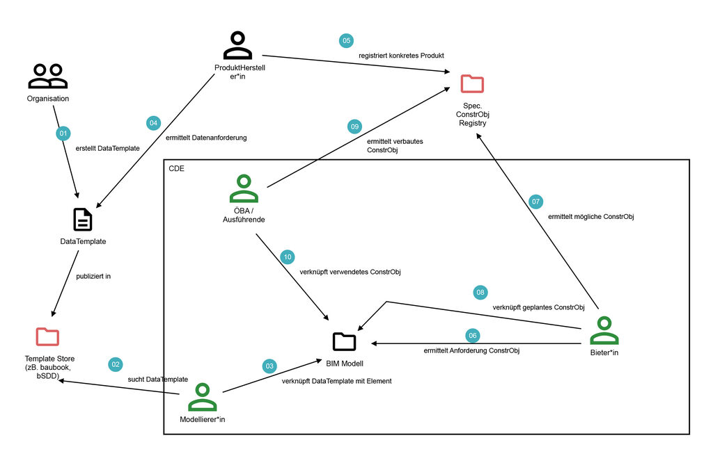 Das Zusammenspiel der unterschiedlichen Akteur*innen wird in Abbildung 2 anschaulich: Grundvoraussetzung ist die Bereitstellung von Data Templates durch unterschiedliche Organisationen (Schritt 01) bzw. von Produktdaten in der Form ebendieser Data Templates durch die Produkthersteller*innen (05). Beim Modellieren wird auf Data Templates zurückgegriffen (02 und 03), sodass die Bietenden nachvollziehen können, welche Produktdaten zu liefern sind (06) und die entsprechenden Datenblätter der geplanten Produkte übermitteln oder gleich mit dem BIM-Modell verknüpfen können (08). In der Praxis kommt es im Bauablauf häufig zu Änderungen der Produkte, sodass die zugeordneten Data Sheets aktualisiert werden müssen (09 und 10).