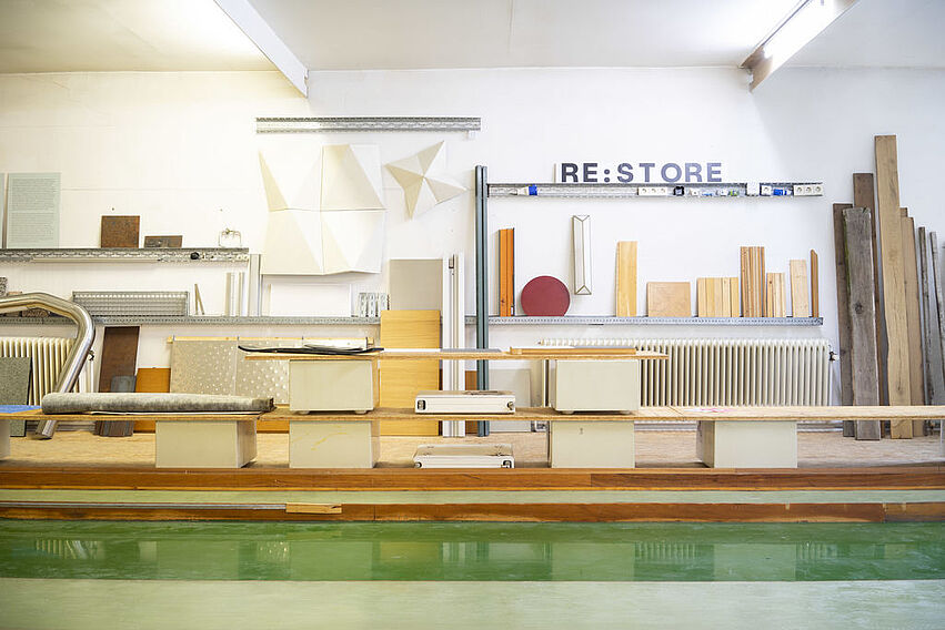 Im re:store werden re:use Bauteile und -Materialien aus Rückbau Gebäuden, Einmal-Events wie Messen oder Theaterkulissen, Off-Cuts und Fehlchargen aus der Produktion online sowie im re:store bzw. re:market direkt vor Ort verkauft. Dienstleistungen zur Bewertung des re:use Potentials von Material und Gebäudekomponenten werden angeboten. Anhand von konkreten Umsetzungsprojekten, Consulting-Tätigkeiten, der Erstellung von Prototypen und der Vermittlung von re:use Bauteilen, wird der bautechnische, architektonische und künstlerische Mehrwert von Projekten mit dem vorgefundenen Material gefördert.