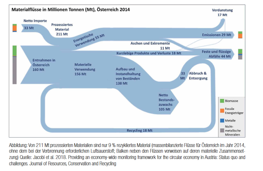 Momentan funktioniert unser Wirtschaftssystem jedoch linear. Rohstoffe werden abgebaut, verwendet oder zu Bestand und dann zu Abfall, von dem ein Bruchteil rezykliert wird. In der Materialflussanalyse für Österreich 2014 (Abbildung 1) sind Biomasse, fossile Energieträger ebenso wie Metalle und nicht metallische Mineralien erfasst. Von 193 Millionen Tonnen (Mt) Input wurden 44 Mt als Abfall verbucht, nur 18 Mt wurden recycliert. Und mehr als die Hälfte, nämlich 105 Mt wurden als Nettobestandszuwachs verzeichnet. Die Bestände, das sind Straßen und Gebäude, volle Kleiderkästen und Autos, sie werden im linearen System früher oder später zu Abfall. Circular Economy soll diesen Abfallbergen entgegenwirken, allzumal die weltweiten Ressourcen zu knapp sind, um alles als Abfall zu entsorgen.