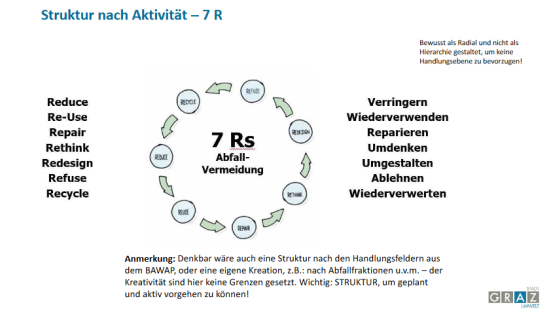 Der Grazer Abfallwirtschaftsplan verwendet 7 R (siehe Abbildung 3). Nach dem AWG Abfallwirtschaftsgesetz (Abbildung 4) werden Produkte nach Ablauf ihrer Lebensdauer entsorgt. Entsorgung umfasst Verwertung und Beseitigung. Verwertung wird unterschieden in thermische Verwertung, die auch schlicht als Verbrennung bezeichnet werden kann und stoffliche Verwertung, auch Recycling genannt. In der Bauwirtschaft bedeutet R vorwiegend Recycling und Re-Use, in Ausnahmefällen auch Rot, wenn Lehm, Stroh, Schafwolle oder andere nachwachsende Rohstoffe (inoffiziell) kompostiert werden.