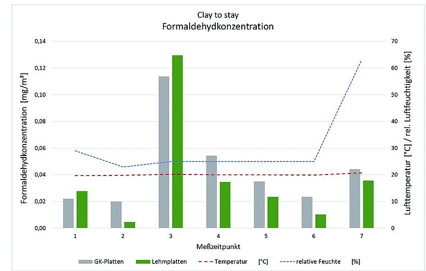 In beiden Räumen nahm die Formaldeyhdkonzentration im Zeitverlauf kontinuierlich ab, wobei die Abnahme innerhalb der ersten drei Stunden bei den GK-Platten 52% und bei den Lehmplatten 73% betrug (Abb. 5). Bei allen Messungen nach Schadstoffeinbringung lag die Formaldehydkonzentration im Lehmplattenprüfraum unter jener des GK-Plattenprüfraums. Zwischen den Messzeitpunkten 6 und 7 erfolgte eine Erhöhung der relativen Luftfeuchtigkeit. Nachdem es sich bei Formaldehyd um eine gut wasserlösliche Substanz handelt, erhöhte sich die Schadstoffkonzentration in der Raumluft beider Räume zu Messzeitpunkt 7, da sich das in den Platten gebundene Formaldehyd wieder in der Raumluft löste.