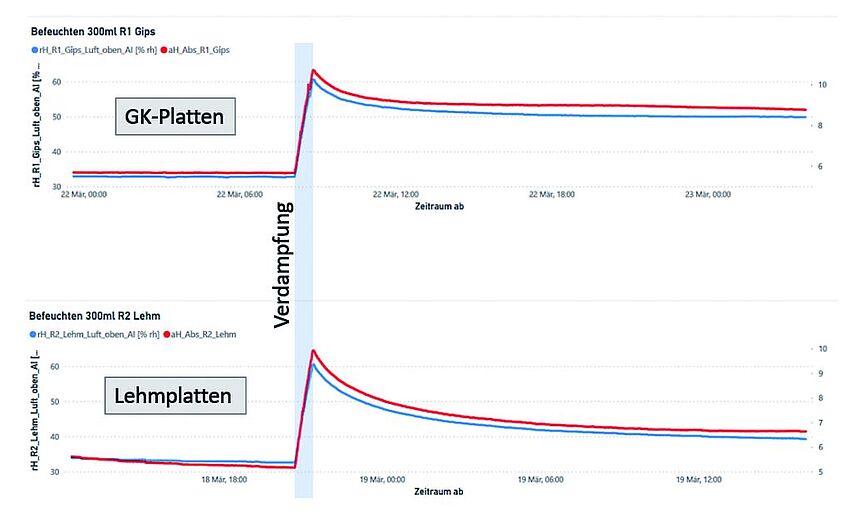 Die ideale Luftfeuchtigkeit in Wohn- und Arbeitsräumen liegt bei 40 bis 60 %. Im Winter sinkt die Feuchtigkeit aufgrund der trockenen Außenluft und der hohen Temperaturen im Innenraum meist auf unter 40 %.(2 Lehm hat das Potential, Feuchtigkeit zu speichern und im Bedarfsfall an die Raumluft abzugeben. Thermisch-hygrische Versuche in der Fassadenbox zeigten, dass bei einer Temperaturerhöhung von 20° auf 30° C die Spitzen im unteren Feuchtebereich von den Lehmplatten abgefedert wurden und so die relative Luftfeuchtigkeit konstant über jener im Raum mit den GK-Platten lag.