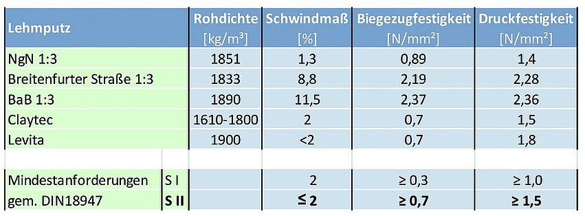 Es wurden drei Materialproben für die Putzanwendung aufbereitet, geprüft und die Untersuchungsergebnisse den normativen Anforderungen für industriell hergestellte Putze (DIN 18947) gegenübergestellt. Eine der Proben (NgN 1:3) erfüllte die Vorgaben für Schwindmaß und Biegezugfestigkeit, die Druckfestigkeit kann durch geringfügige Erhöhung der mineralischen Zuschläge noch erhöht werden. Die beiden anderen Proben (Breitenfurter Straße, BaB) wären für die Anwendung noch weiter zu magern (Mischungsverhältnis 1:4 bzw. 1:5), um das Schwindmaß auf die geforderte Höhe zu reduzieren. Die Festigkeitswerte liegen weit über dem geforderten Maß für Lehmputze (Tabelle 1).
