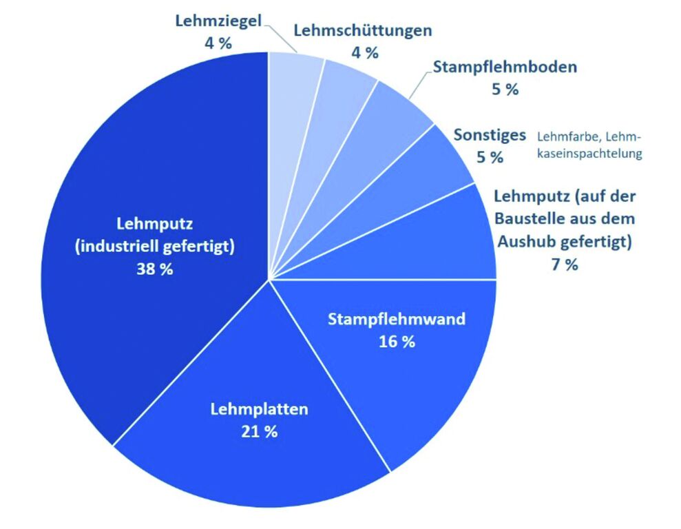Im Rahmen des Projektes Clay to stay wollten wir wissen, inwieweit der Lehmbau in der österreichischen Baubranche angewendet wird und haben dafür gemeinsam mit dem Projektpartner KMFA (KMU-Forschung Austria) sowohl qualitative Interviews mit Architekt:innen als auch quantitative Befragungen in der Sparte Gewerbe und Handwerk der WKO (1 und unter Planenden durchgeführt. Das Erfreuliche: alle, die Lehm schon einmal bei einem Bauvorhaben eingesetzt haben, würden ihn wieder einsetzen. Als größte Stärken und Vorteile des Baustoffes wurden dessen ökologische Nachhaltigkeit, die feuchtigkeitsregulierenden Eigenschaften und die gesundheitliche Unbedenklichkeit angeführt. Bei den Schwächen und Nachteilen dominierten das fehlende Wissen zu Lehm und dessen Anwendung, Aufwand und Kosten bei der Verarbeitung sowie die Unsicherheit bezüglich vorhandener Regelwerke. Vorrangig werden Lehmputz, Lehmplatten sowie Stampflehmwände eingesetzt, Lehmschüttungen und Stampflehmböden werden noch selten ausgeführt (Abb. 1).
