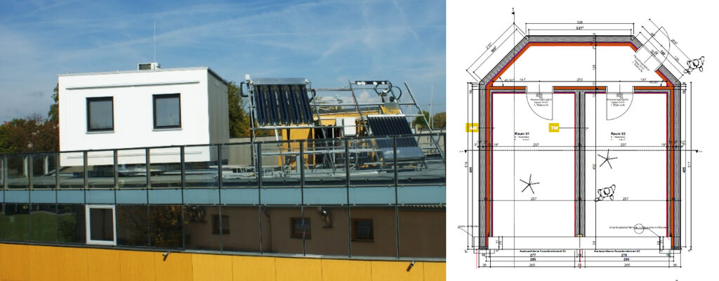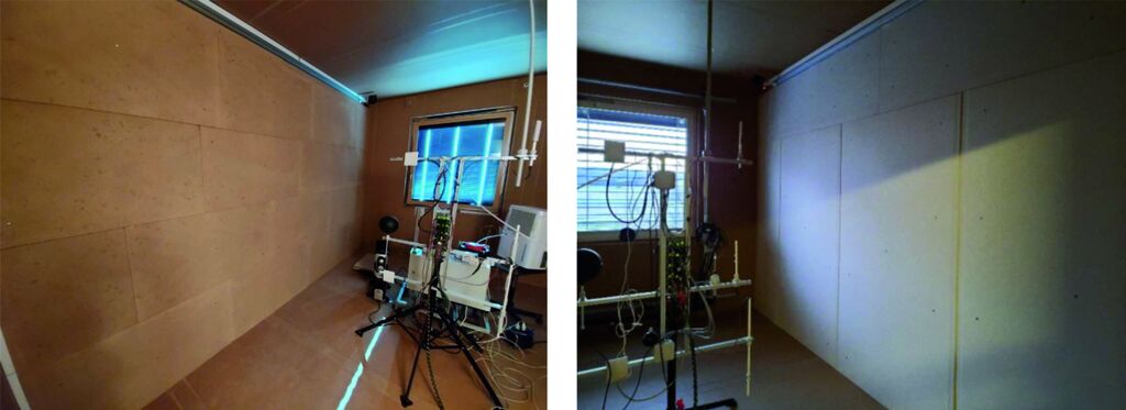 Für die vergleichende Untersuchung wurden Lehmplatten und Gipskartonplatten (GK-Platten) herangezogen. GK-Platten, weil sie aktuell ein häufig eingesetzter Baustoff sind, an dessen Stelle auch Lehmplatten zum Einsatz kommen können. Um valide Daten zu erhalten und mögliche Einflussfaktoren auszuschließen, fanden die Untersuchungen in zwei völlig baugleichen Räumen der AEE INTEC in Gleisdorf (Abb. 2) statt. Die Prüfräume der Fassadenbox sind mit zahlreichen Sensoren und der Möglichkeit, unterschiedliche Heiz- und Kühlszenarien zu simulieren, ausgestattet. Einer der Räume wurde mit Lehmplatten, der andere mit GK-Platten ausgestattet (je eine Wand mit einer Fläche von ca. 11 m²) (Abb. 3). Im Vorfeld wurden praxisbezogene Alltagssituationen festgelegt, welche die Grundlage der Versuchsablaufplanung bildete. Für ein höchstes Maß an Reproduzierbarkeit erfolgte die programmtechnische Einbindung des Versuchsablaufs in die Anlagensteuerung.