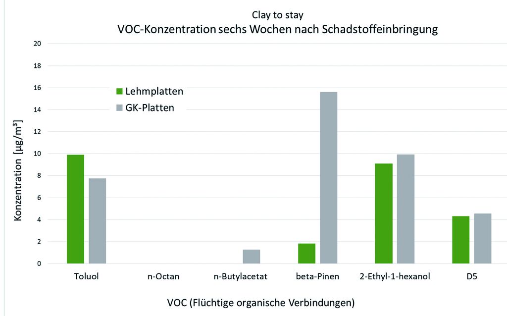 Die Kontrollmessung sechs Wochen nach Schadstoffeinbringung zeigte – wenn auch teilweise nur geringfügig – niedrigere Konzentrationen bei allen eingebrachten flüchtigen organischen Verbindungen (VOC) im Lehmplattenraum mit Ausnahme von n-Octan (nicht messbare Konzentration) und Toluol (Abb. 6). Bei allen eingebrachten VOCs handelt es sich um schlecht, sehr schlecht wasserlösliche bzw. nicht wasserlösliche Verbindungen. Die Ergebnisse der Messungen lassen darauf schließen, dass die Luftschadstoffaufnahme von Lehm unabhängig ist von dessen Fähigkeit, feuchteregulierend zu wirken. Für belastbare Aussagen sind jedoch weitere, umfassendere Untersuchungen notwendig.