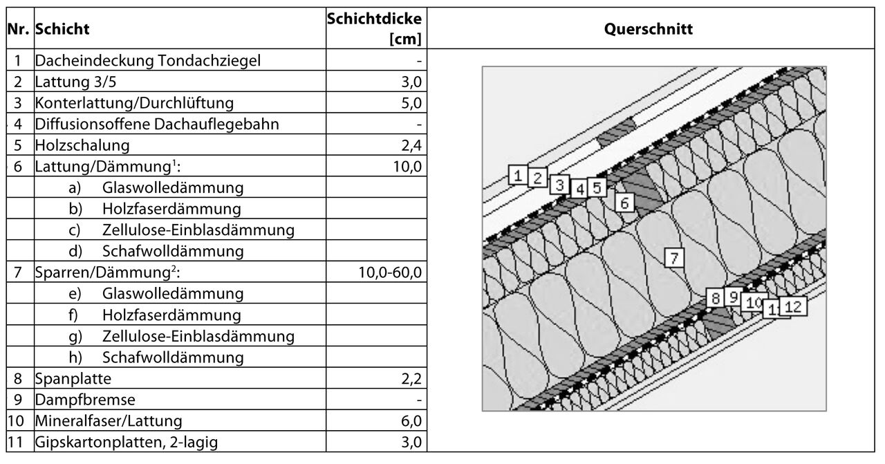 Am Beispiel eines Steildachaufbaus wurden für verschiedene Dämmmaterialien der ökologische und der Kostenaufwand für Errichtung und Betrieb ermittelt. Tabelle 2 zeigt den Aufbau der Konstruktion.