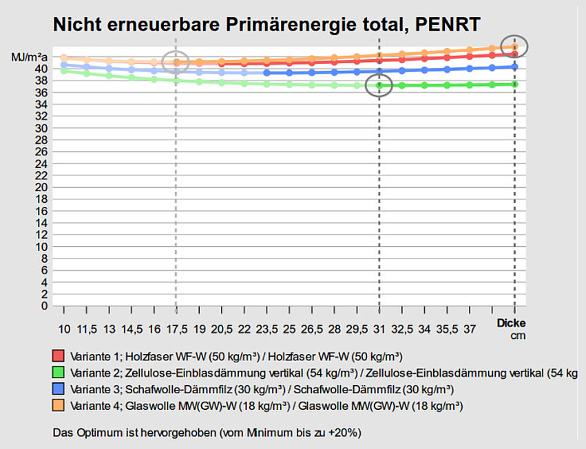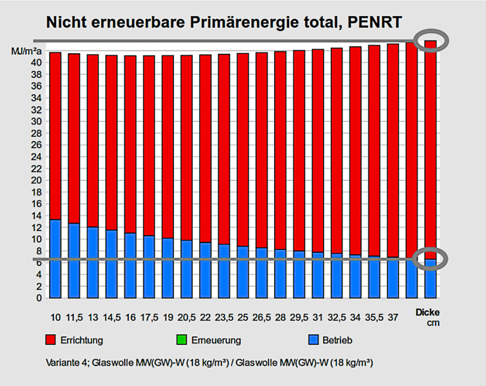 Erweitert man den Auswahlrahmen um die ökologischen Faktoren, zeigt sich nach Abbildung 2, dass mit einer rein kostenorientierten Auswahl ein erhöhter Ressourcenverbrauch einhergeht. Konkret bedeutet die Verwendung von 40 cm Glaswolle einen Bedarf an nicht erneuerbarer Primärenergie von ca. 44 MJ/m²a gegenüber etwa 37 MJ/m²a beim Einsatz von Zellulose-Einblasdämmung